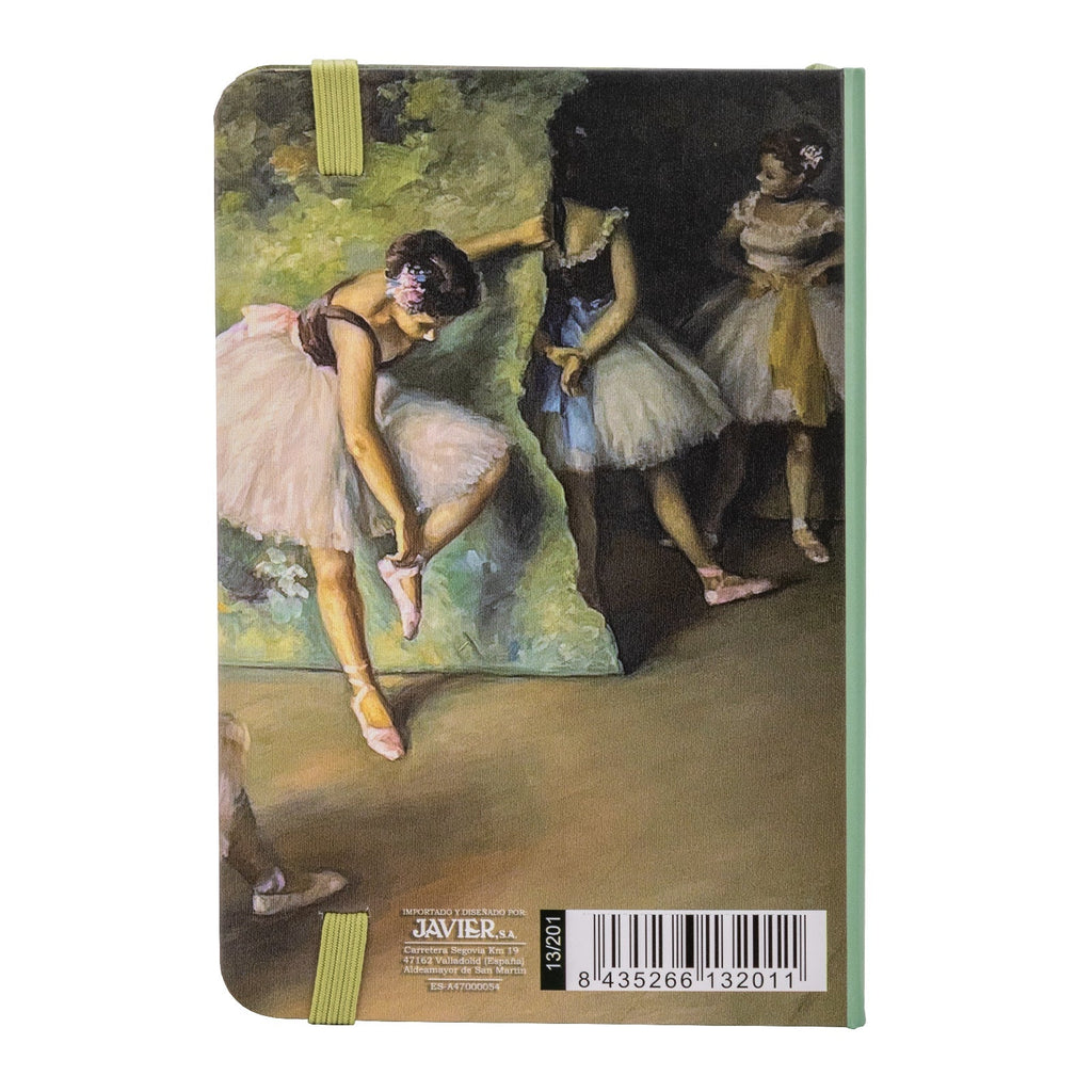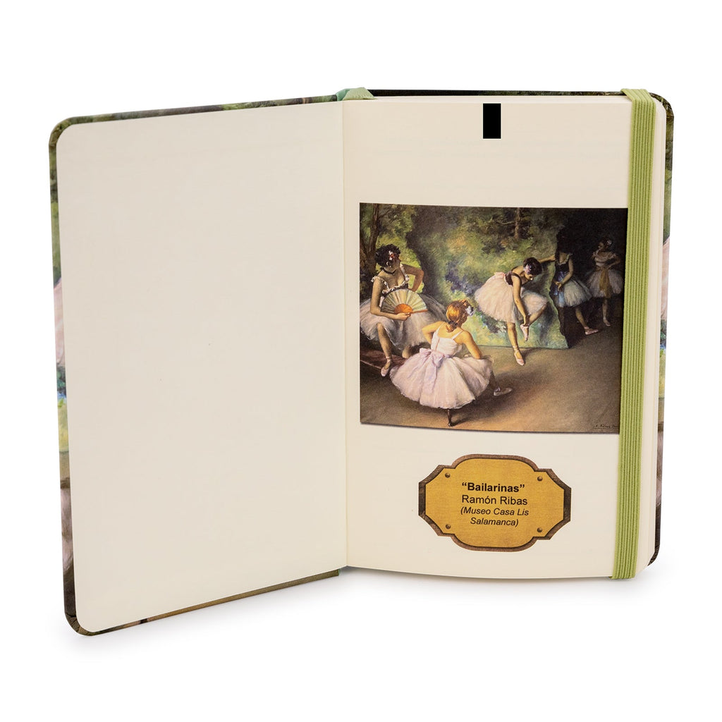 Libreta de notas en formato A6 JAVIER Bailarinas con cubiertas rígidas estampadas, cierre de goma y marca páginas de tela, perfecta para llevar contigo a cualquier lugar por su tamaño compacto y su practicidad.