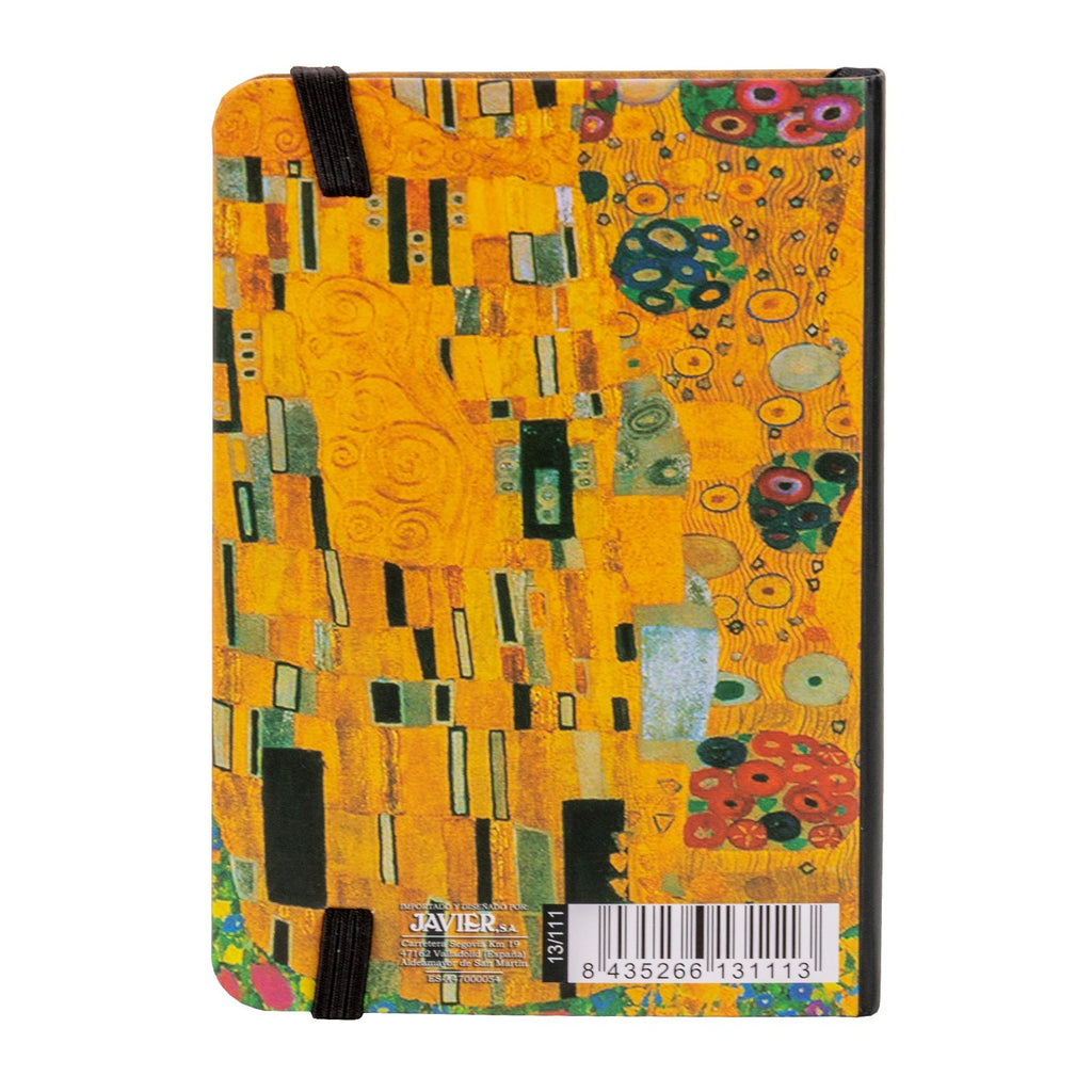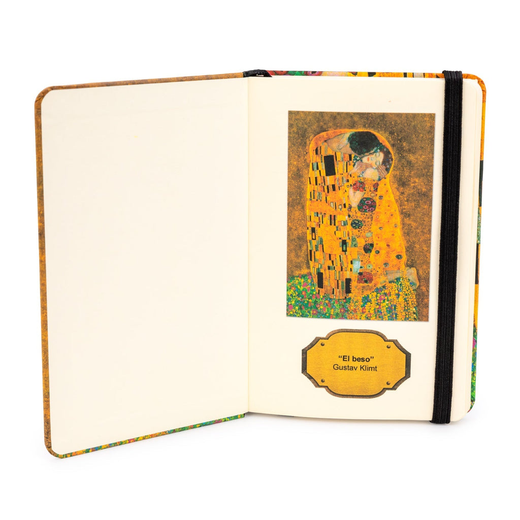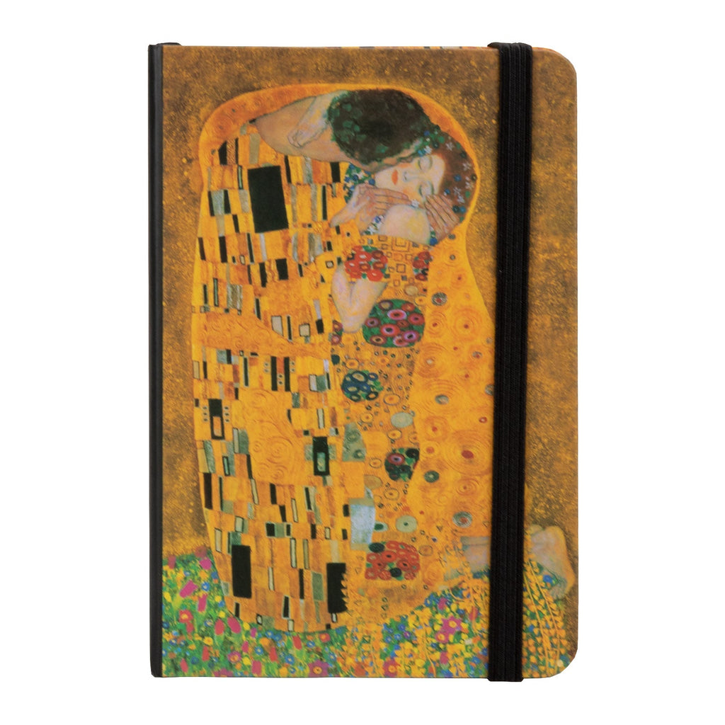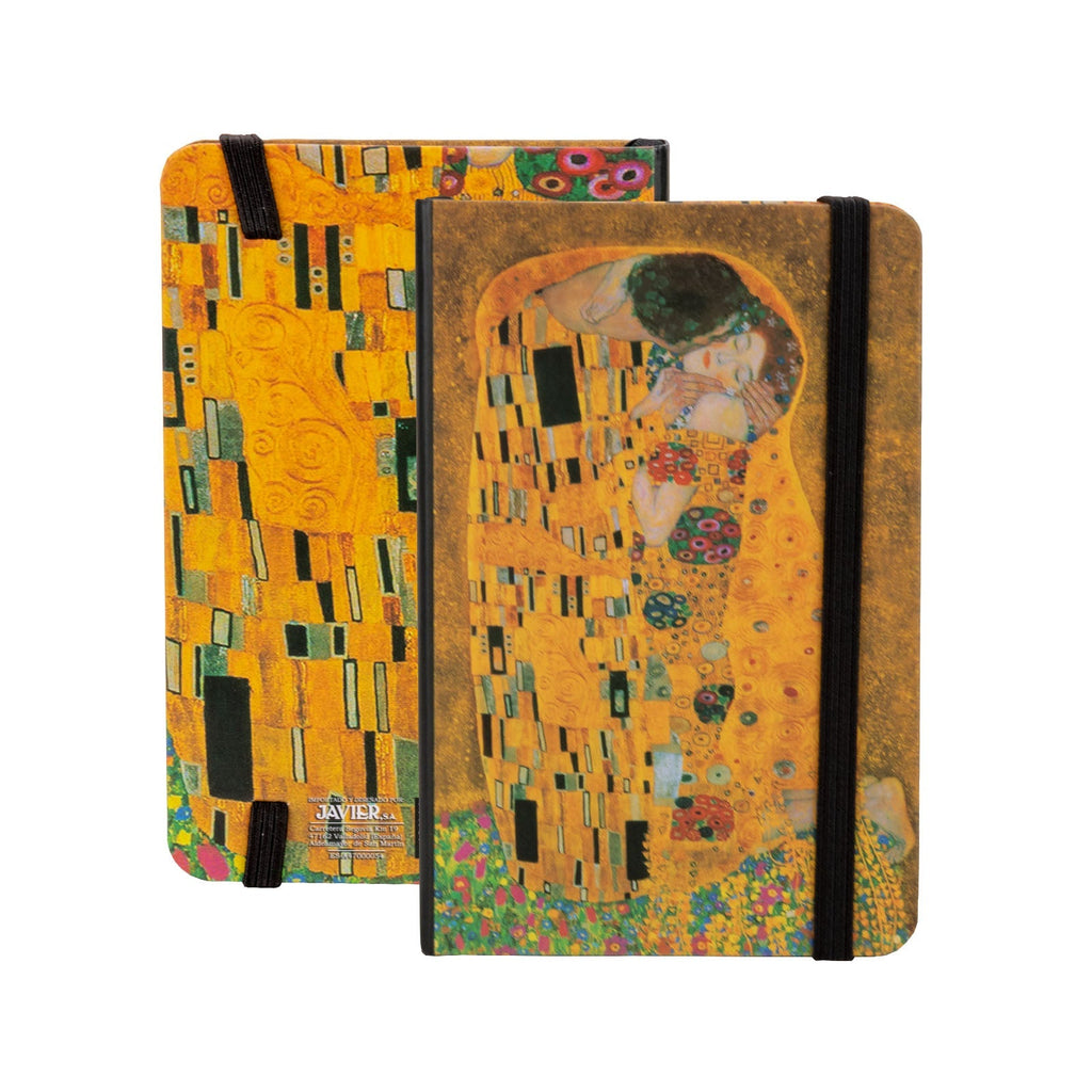 Libreta de notas en formato A6 JAVIER El Beso con cubiertas rígidas estampadas, cierre de goma y marca páginas de tela, perfecta para llevar contigo a cualquier lugar por su tamaño compacto y su practicidad.
