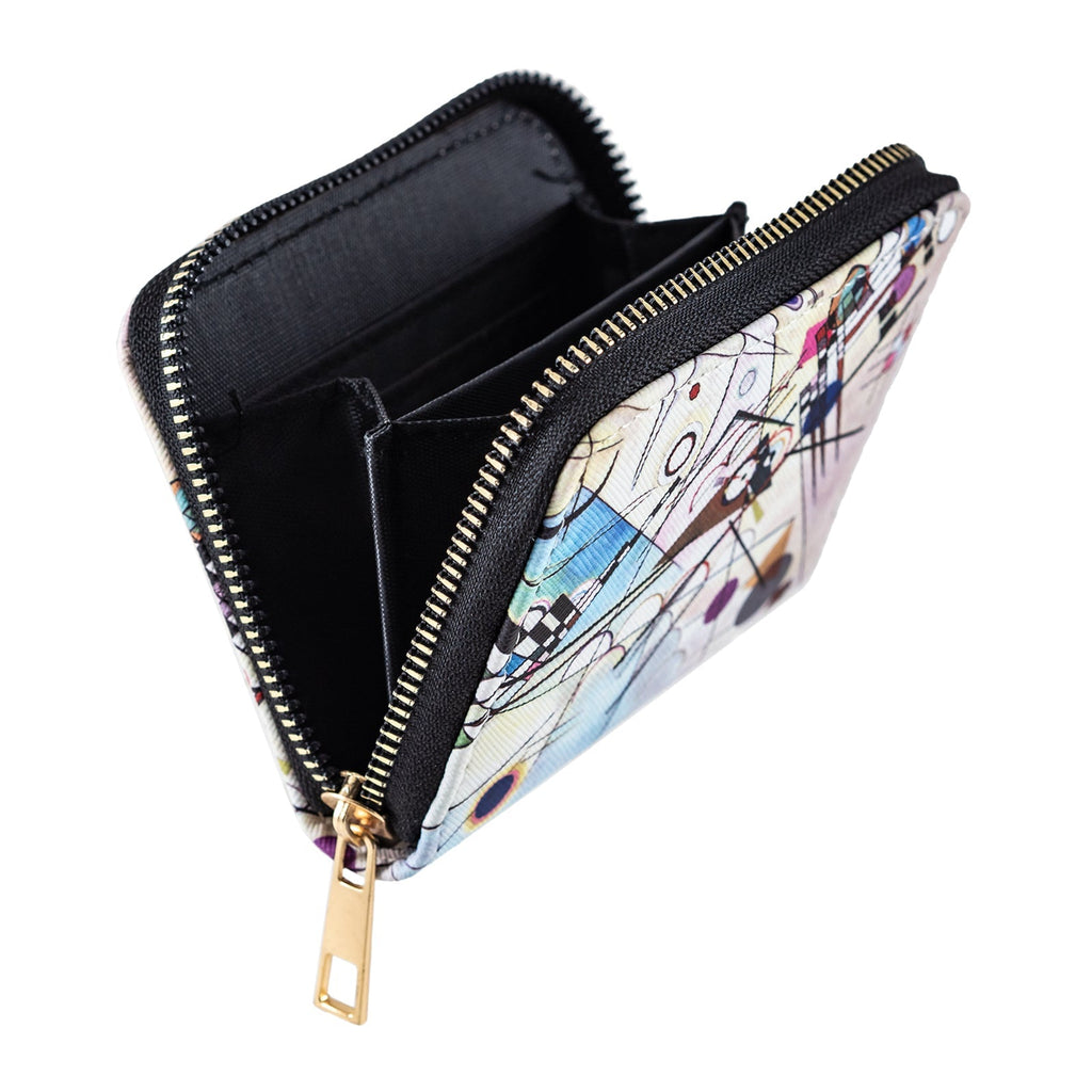 Monedero pequeño tipo cartera para mujer JAVIER Kandinski con cierre de cremallera. Formato ideal para llevar en bolsos pequeños, riñoneras o mochilas ya que tiene un diseño muy compacto.