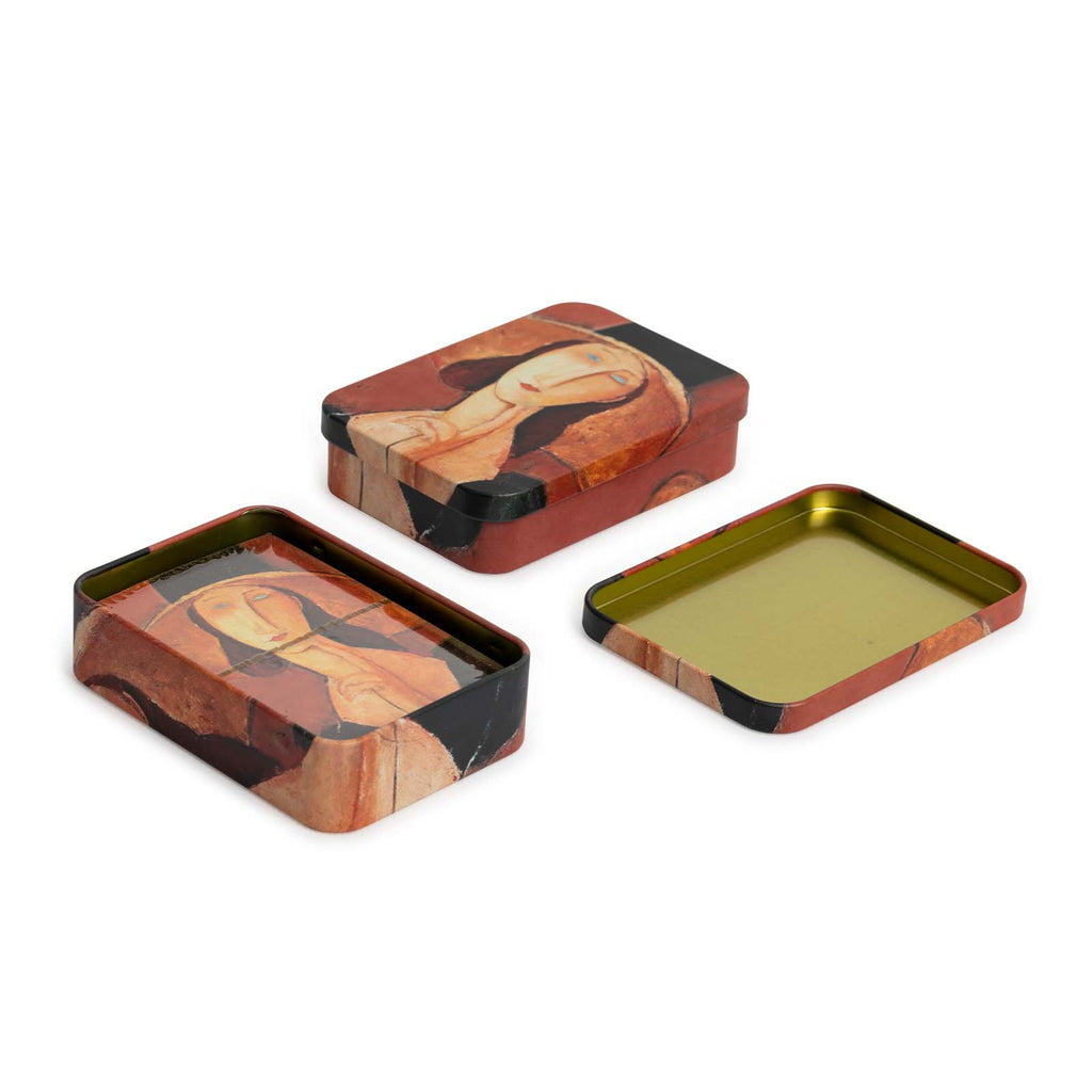 Se presentan en un estuche metálico con el mismo dibujo que el reverso de las cartas y cuenta con cierre a presión. Perfecto para que te puedas llevar tu baraja a cualquier lugar de forma segura.