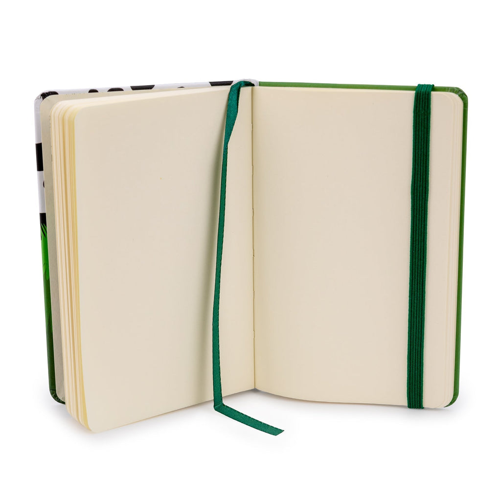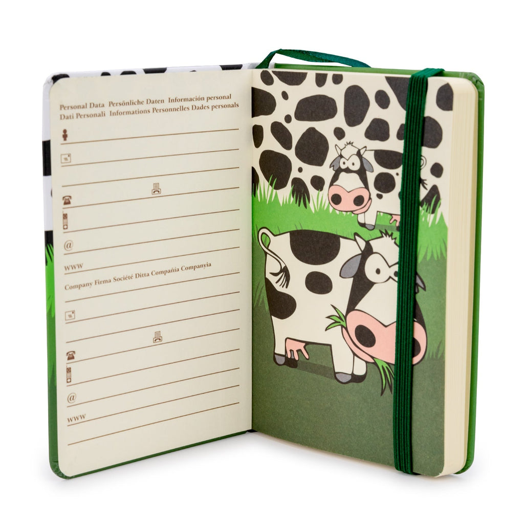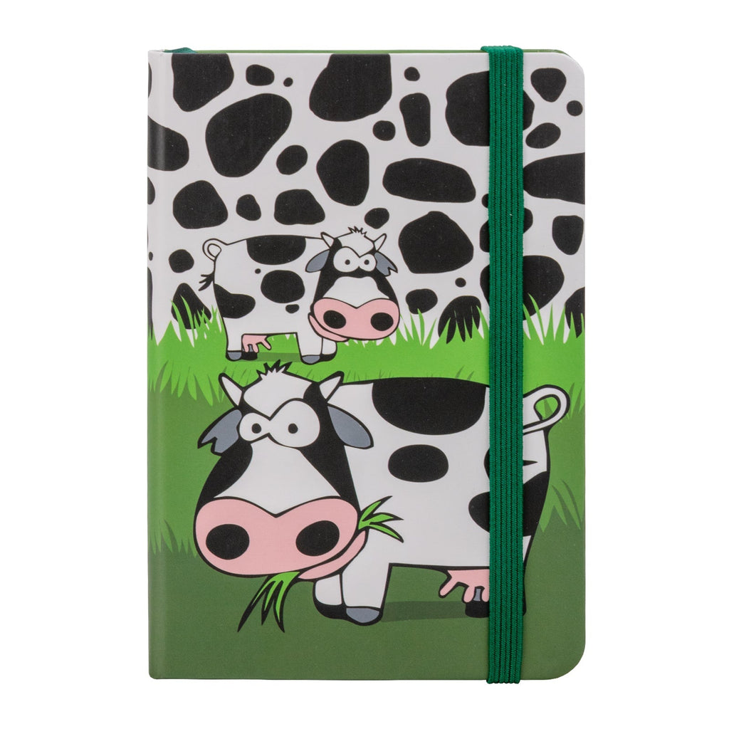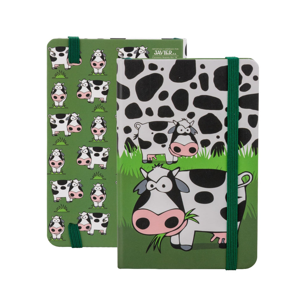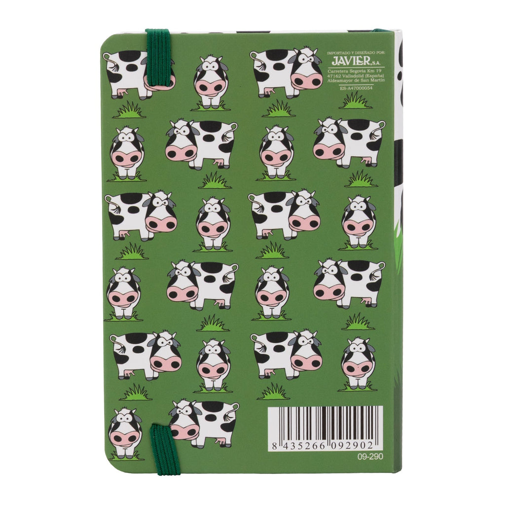 Libreta de notas en formato A6 JAVIER Vaca con cubiertas rígidas estampadas, cierre de goma y marca páginas de tela, perfecta para llevar contigo a cualquier lugar por su tamaño compacto y su practicidad.