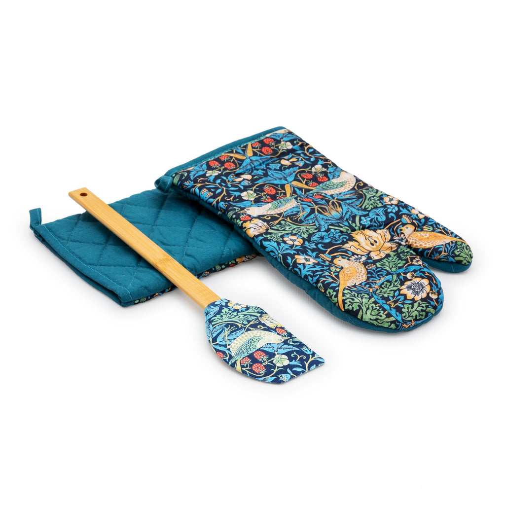 Juego de 2 guantes o manoplas de cocina JAVIER William Morris fabricados en 100% algodón, perfectos para manipular el horno, barbacoas, etc. Ideales para proteger bien tus manos y muñecas de las quemaduras. Incluye espátula de silicona y mango de bambú a juego.