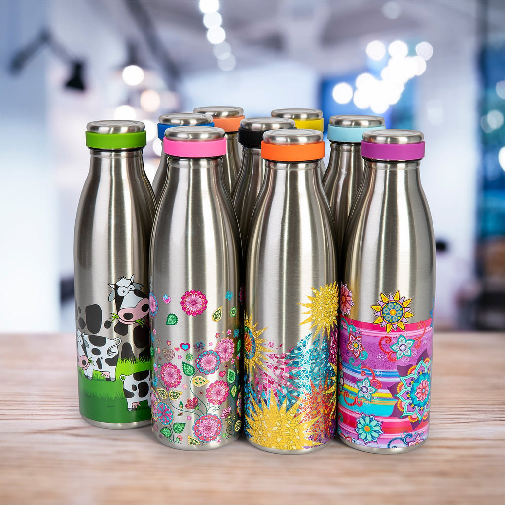 Botella de agua reutilizable fabricada en doble capa de acero inoxidable de calidad alimentaria 316, utilizado para fabricar instrumental médico y de laboratorio por su máxima calidad y excepcionales propiedades anti-corrosión. Tapón roscado. Mantiene tus bebidas frías durante 24 horas y calientes durante 7.