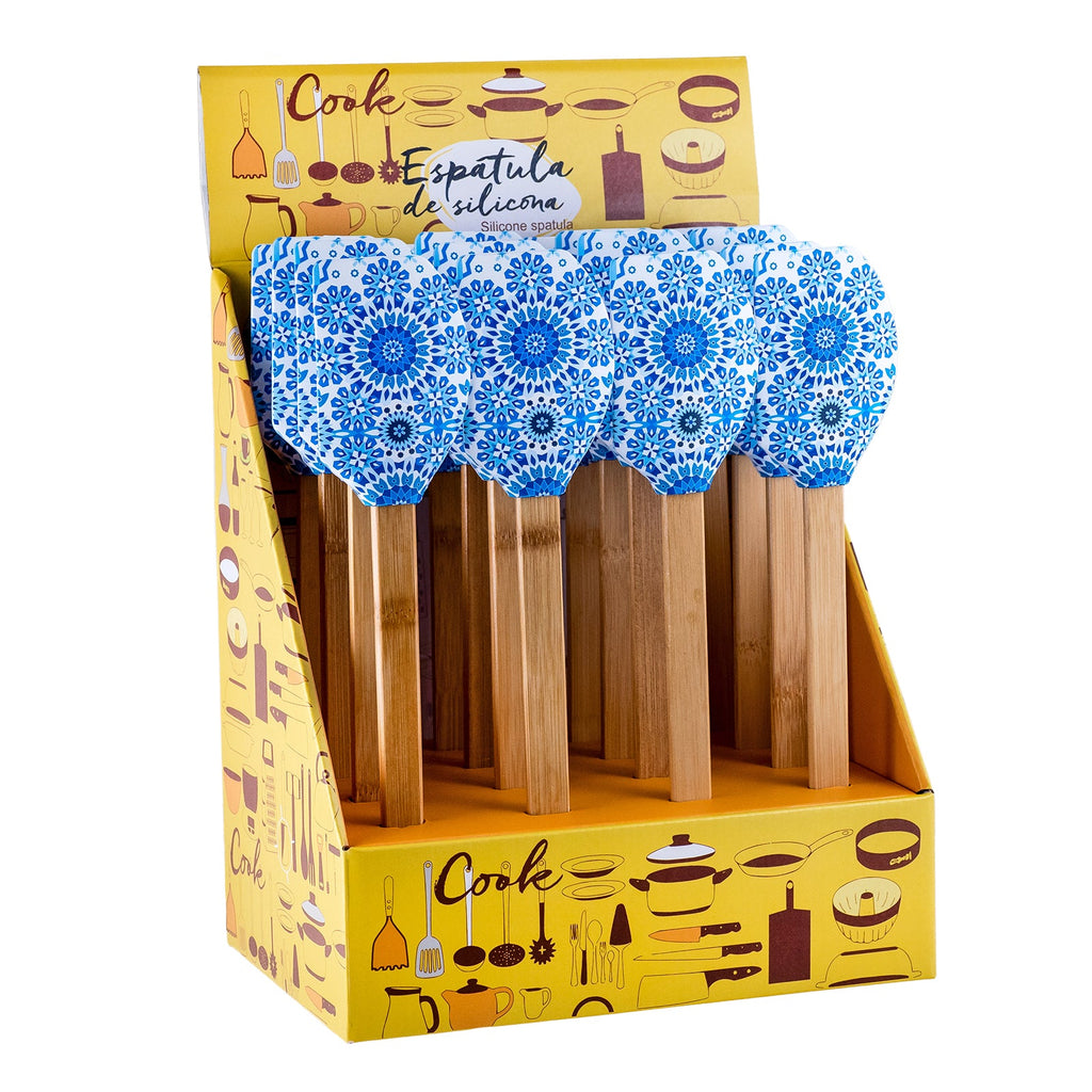 Espátula de cocina tipo lengua de gato de la colección Arabesque de Javier. Está fabricada en silicona con mango de bambú, materiales muy resistentes, por lo que es un utensilio perfecto para tu día a día.
