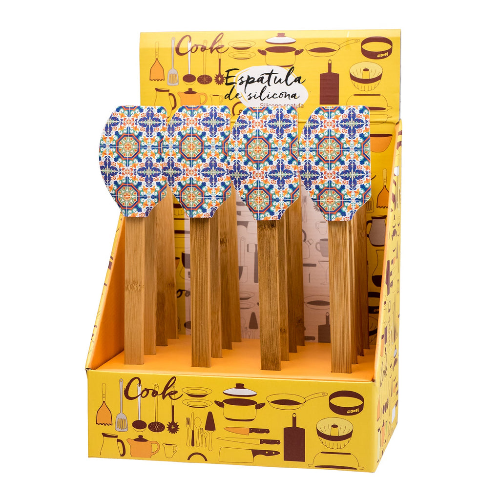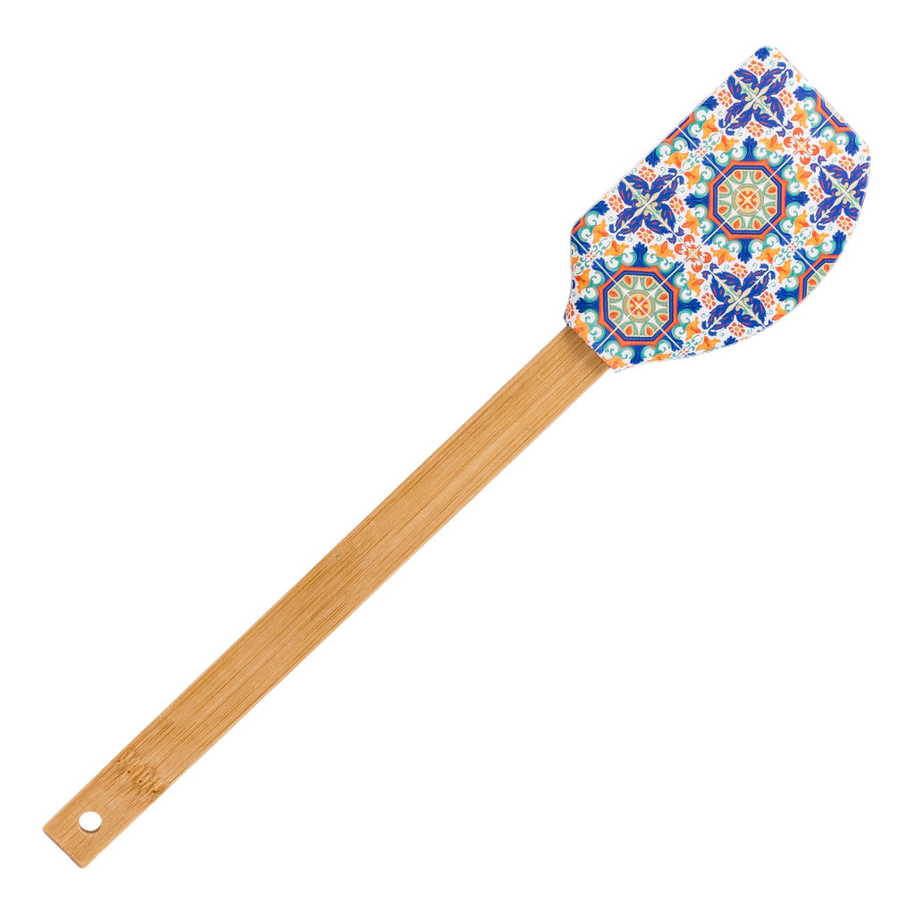 Espátula de cocina tipo lengua de gato de la colección Azulejos de Javier. Está fabricada en silicona con mango de bambú, materiales muy resistentes, por lo que es un utensilio perfecto para tu día a día.
