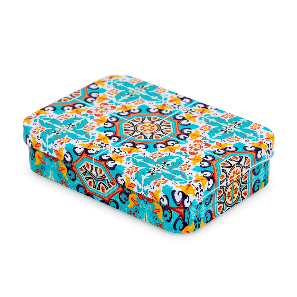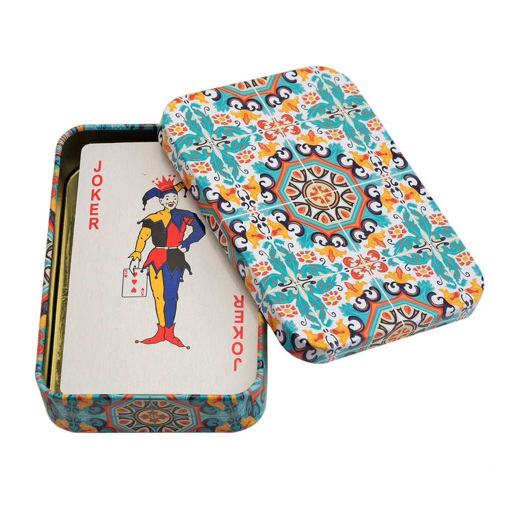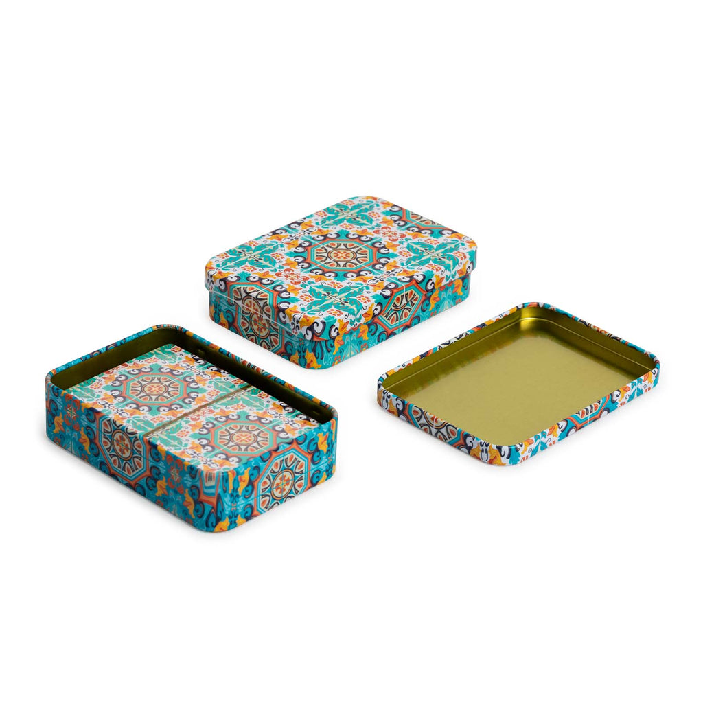 Se presentan en un estuche metálico con el mismo dibujo que el reverso de las cartas y cuenta con cierre a presión. Perfecto para que te puedas llevar tu baraja a cualquier lugar de forma segura.