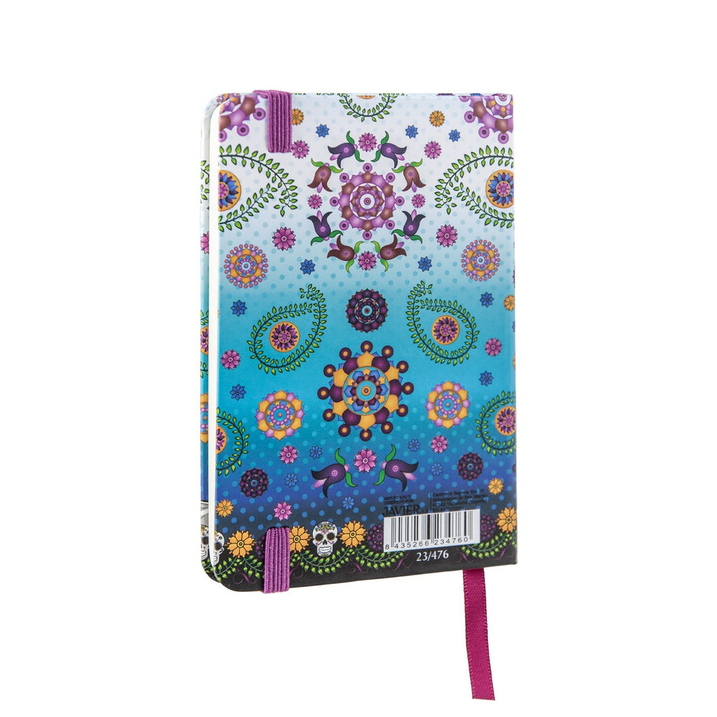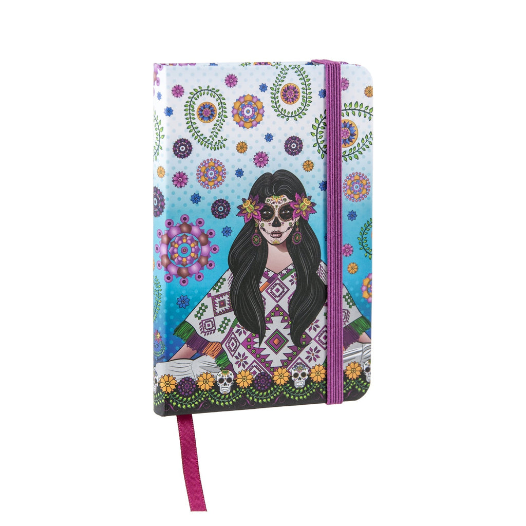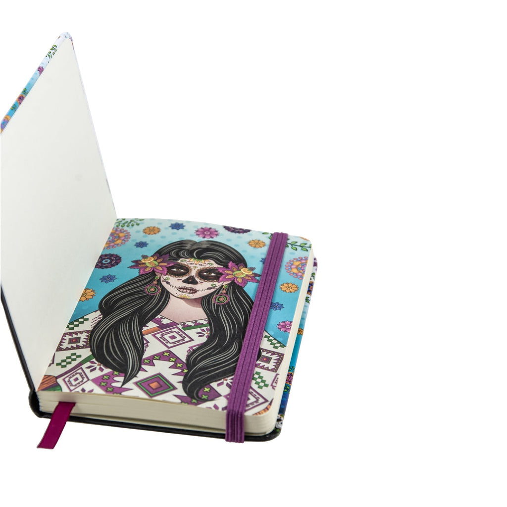 Libreta de notas en formato A6 JAVIER Catrina con cubiertas rígidas estampadas, cierre de goma y marca páginas de tela, perfecta para llevar contigo a cualquier lugar por su tamaño compacto y su practicidad.