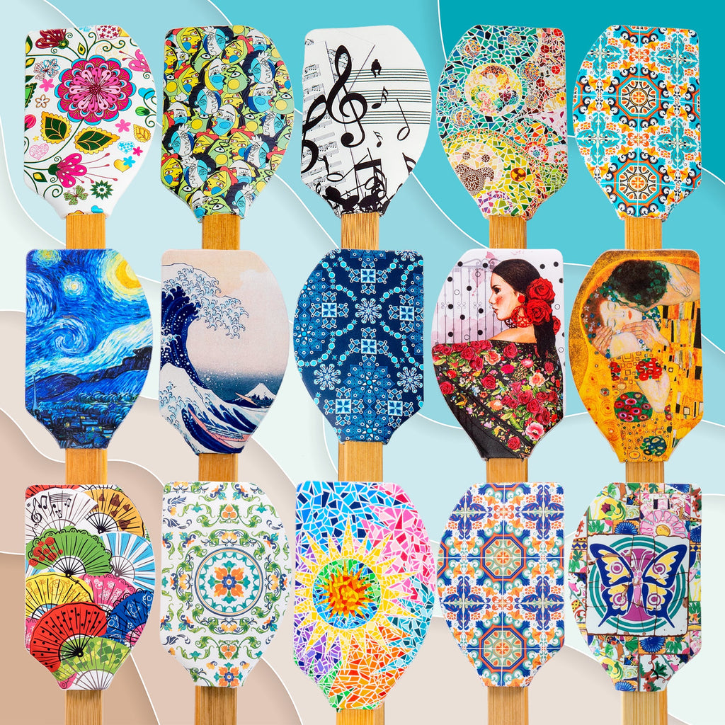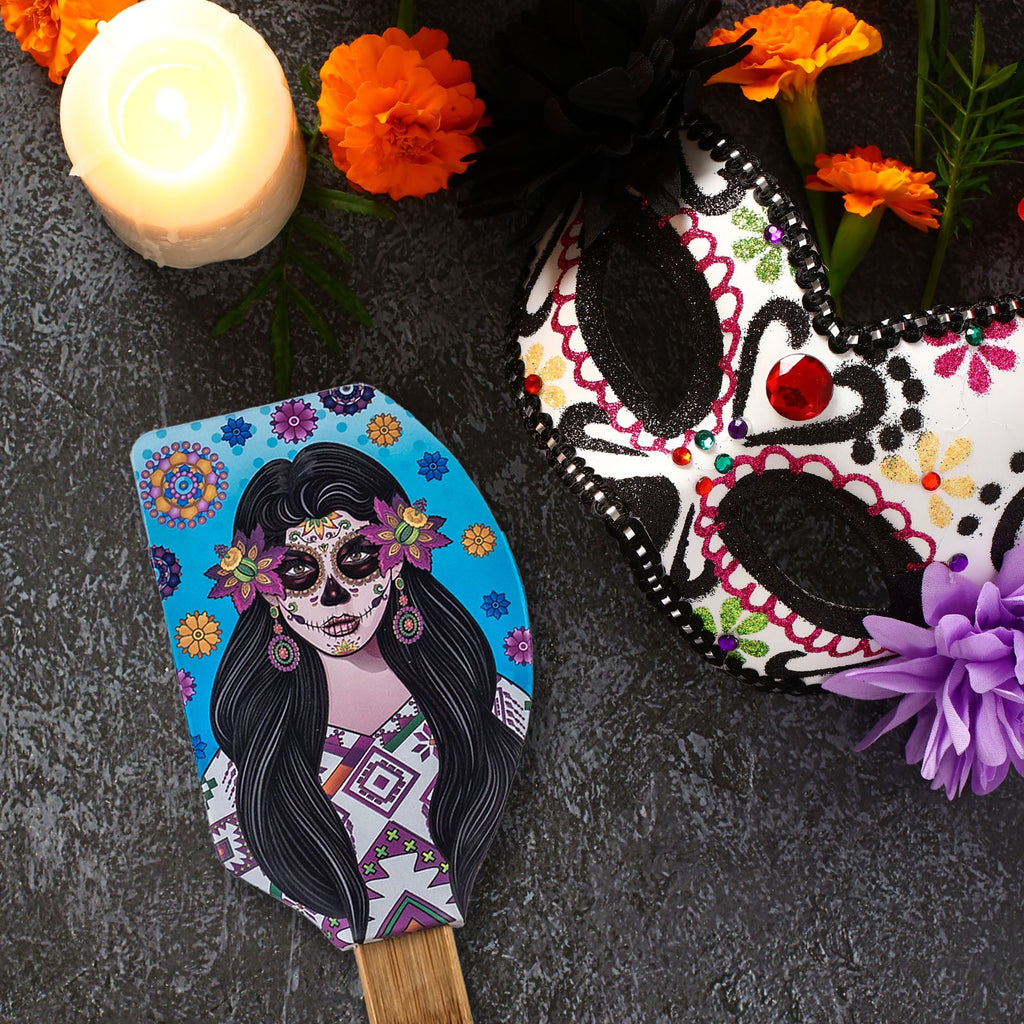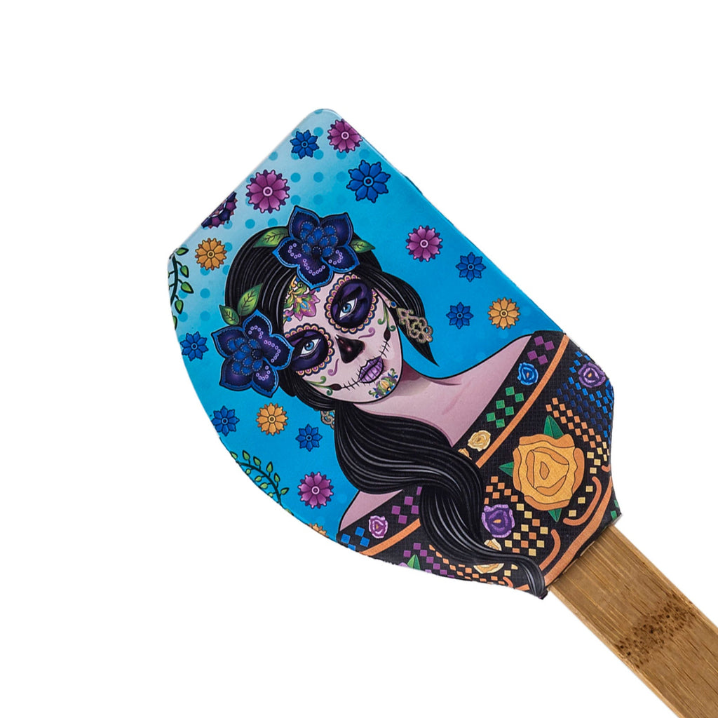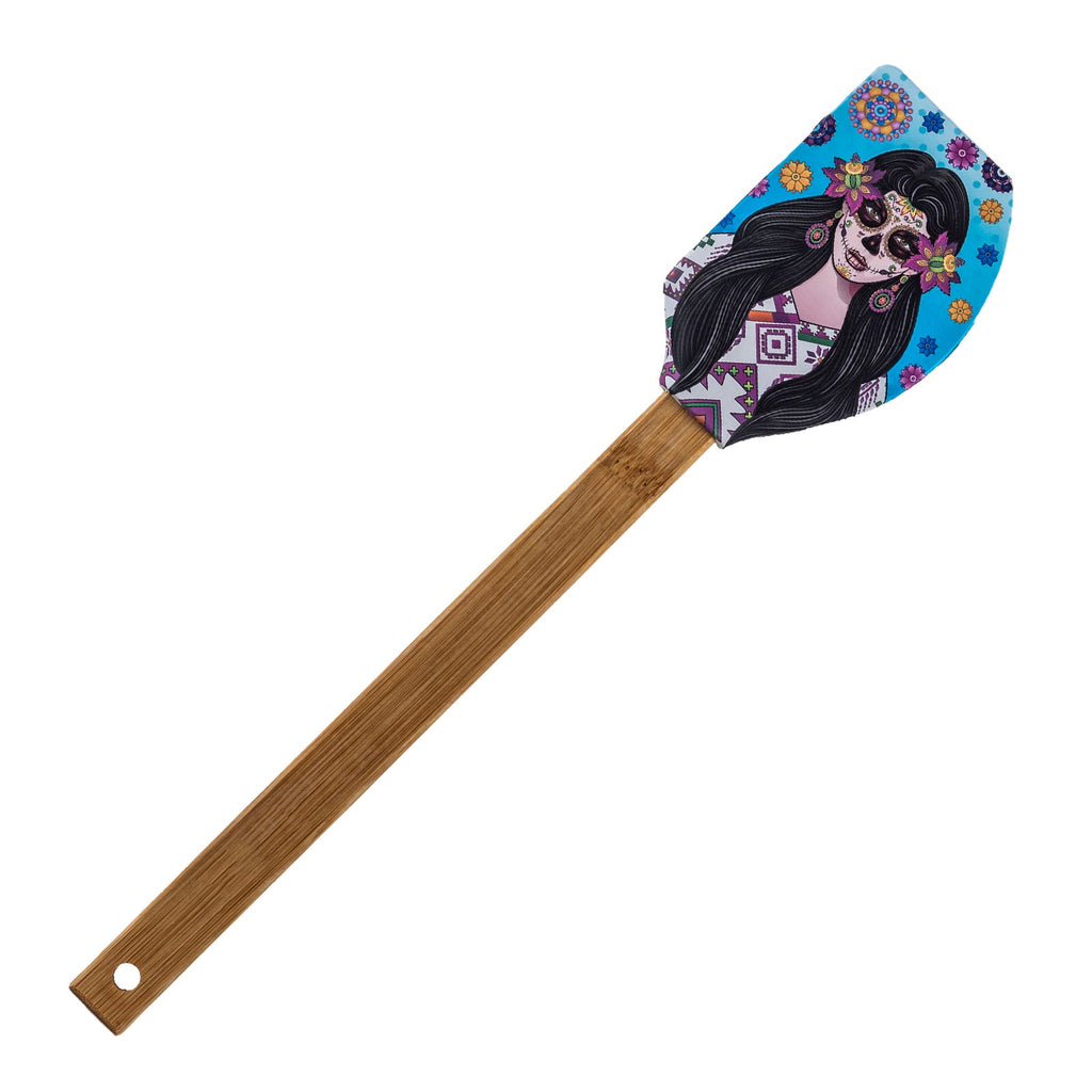 Espátula de cocina tipo lengua de gato de la colección Catrinas de Javier. Está fabricada en silicona con mango de bambú, materiales muy resistentes, por lo que es un utensilio perfecto para tu día a día.