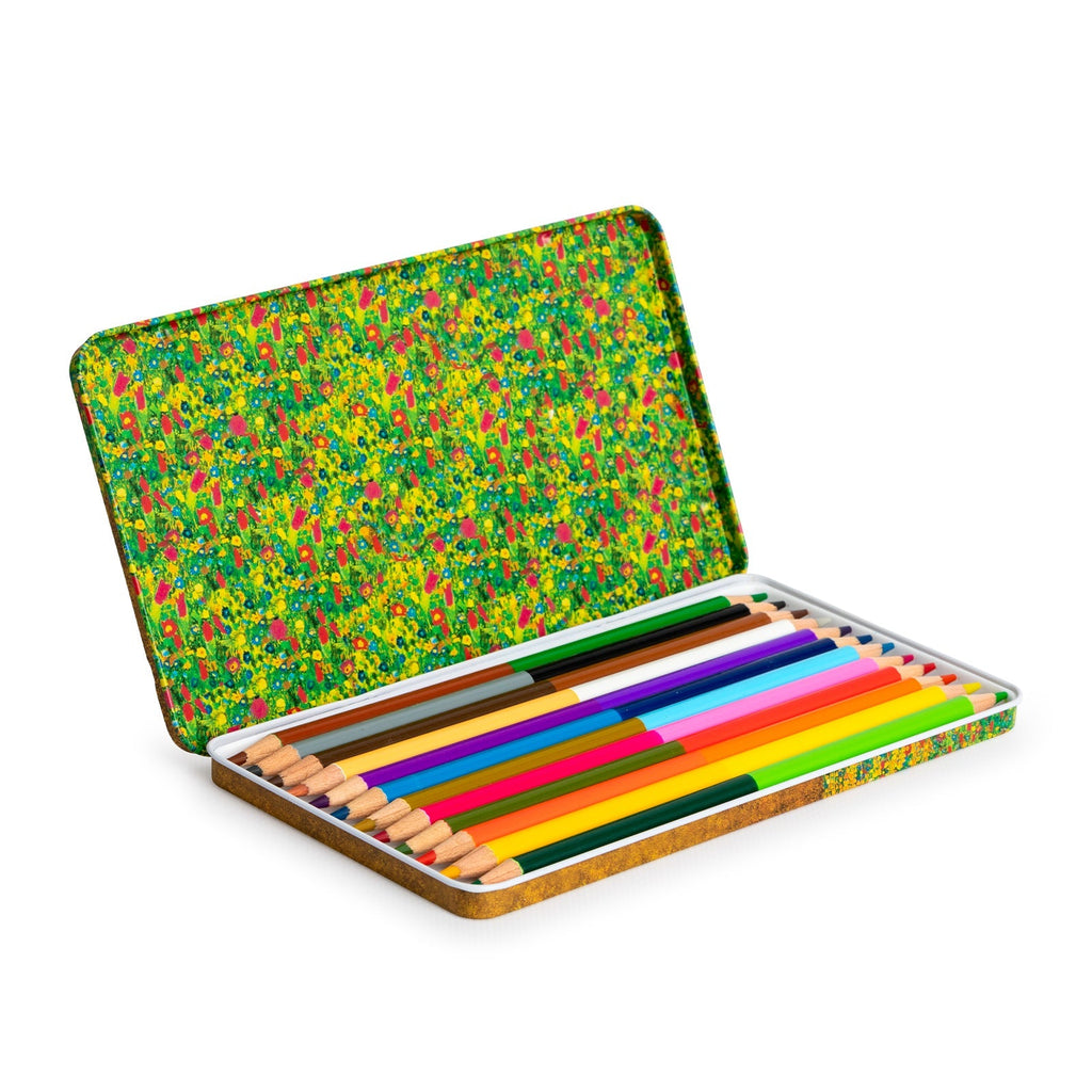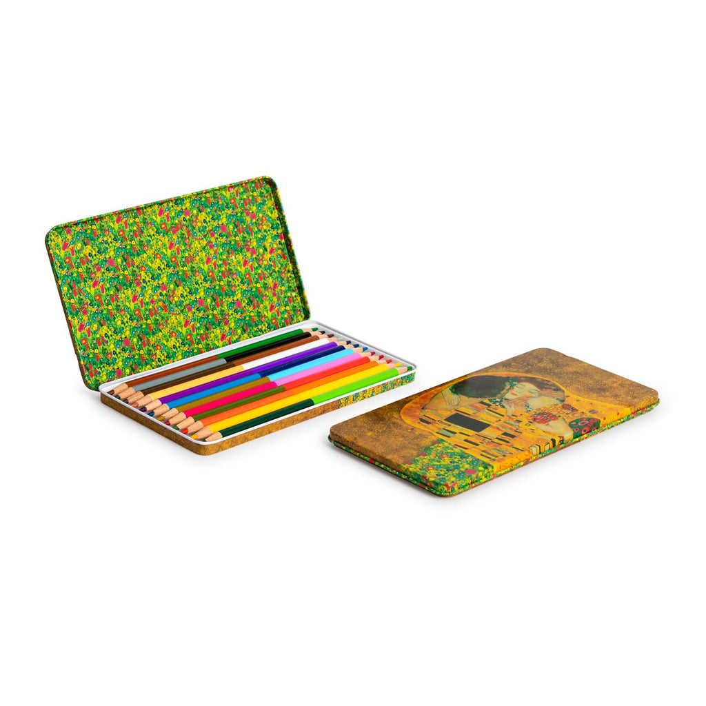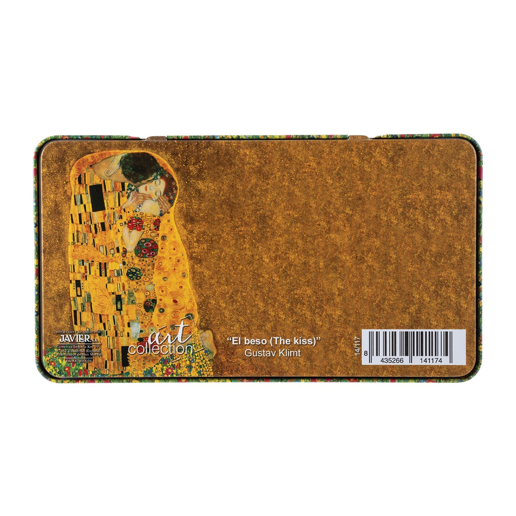 Caja metálica con 12 lápices de color con doble punta JAVIER El Beso presentados en un estuche decorado con motivos de la colección. Están fabricados en madera y, al ser dobles, dispondrás de 24 colores vivos distintos en menos espacio.