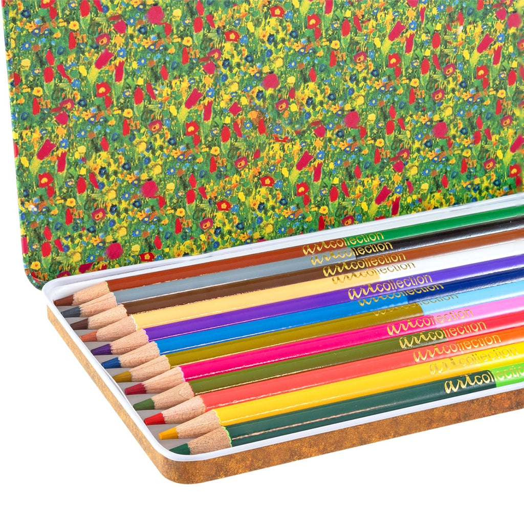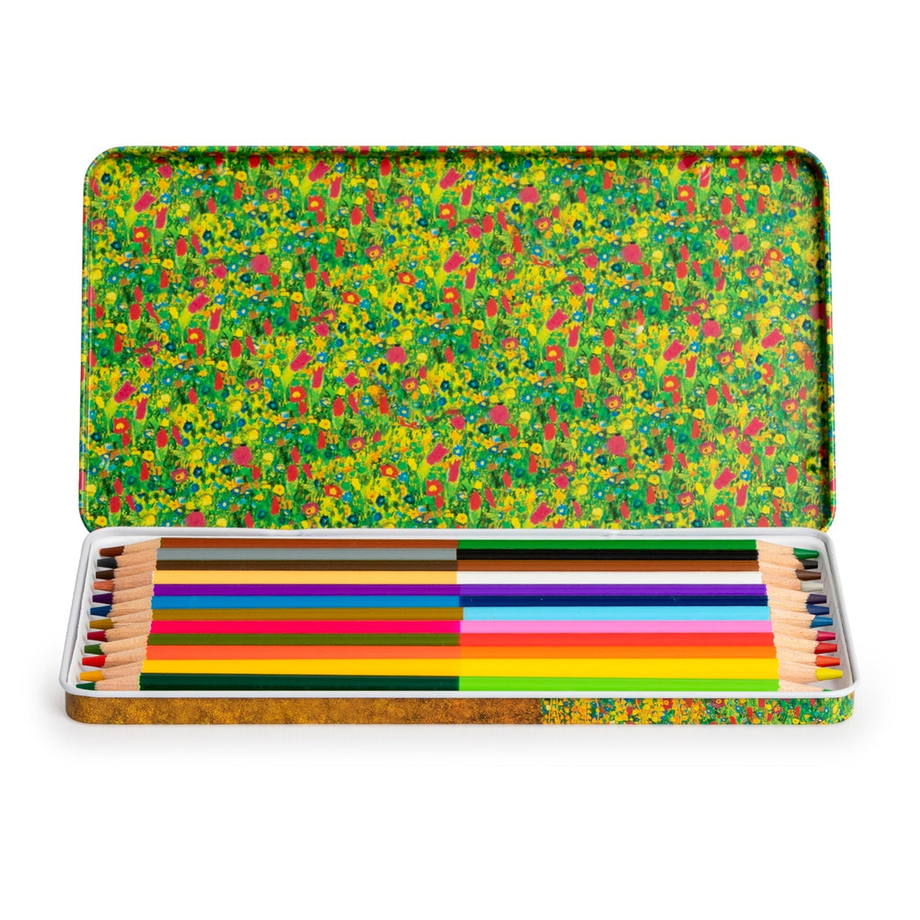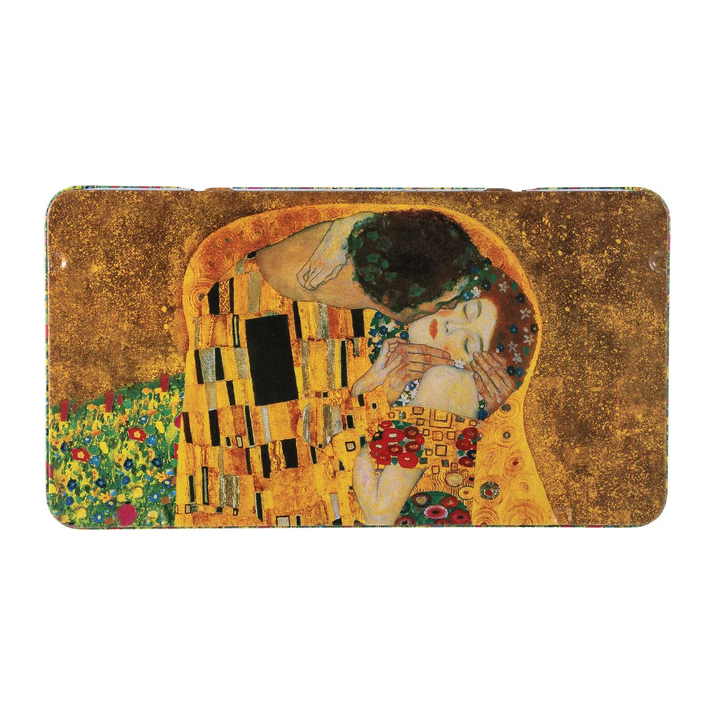 Caja metálica con 12 lápices de color con doble punta JAVIER El Beso presentados en un estuche decorado con motivos de la colección. Están fabricados en madera y, al ser dobles, dispondrás de 24 colores vivos distintos en menos espacio.