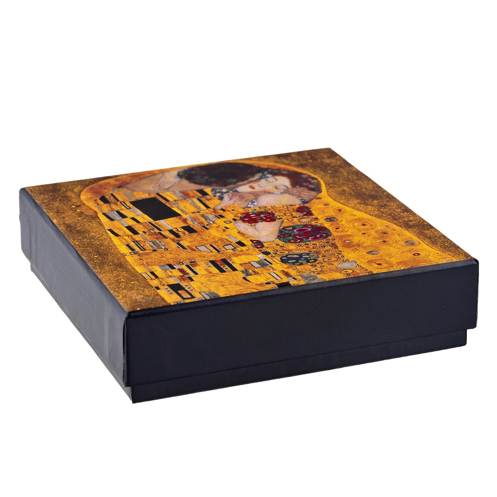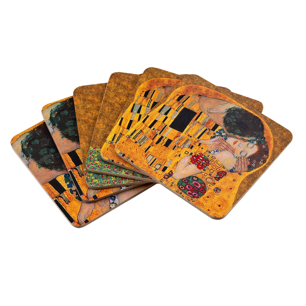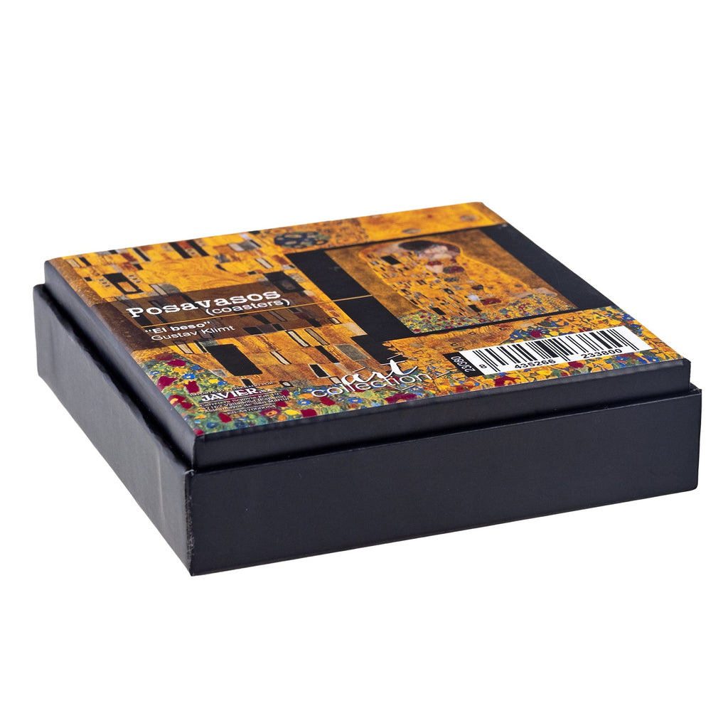 Juego de 6 posavasos cuadrados de 10 cm de la colección El Beso de Klimt de Javier. Están fabricados en madera con base antideslizante de corcho y parte superior impresa en distintos diseños. Vienen presentados en una caja de cartón, perfecta para guardarlos y decorar a la vez.