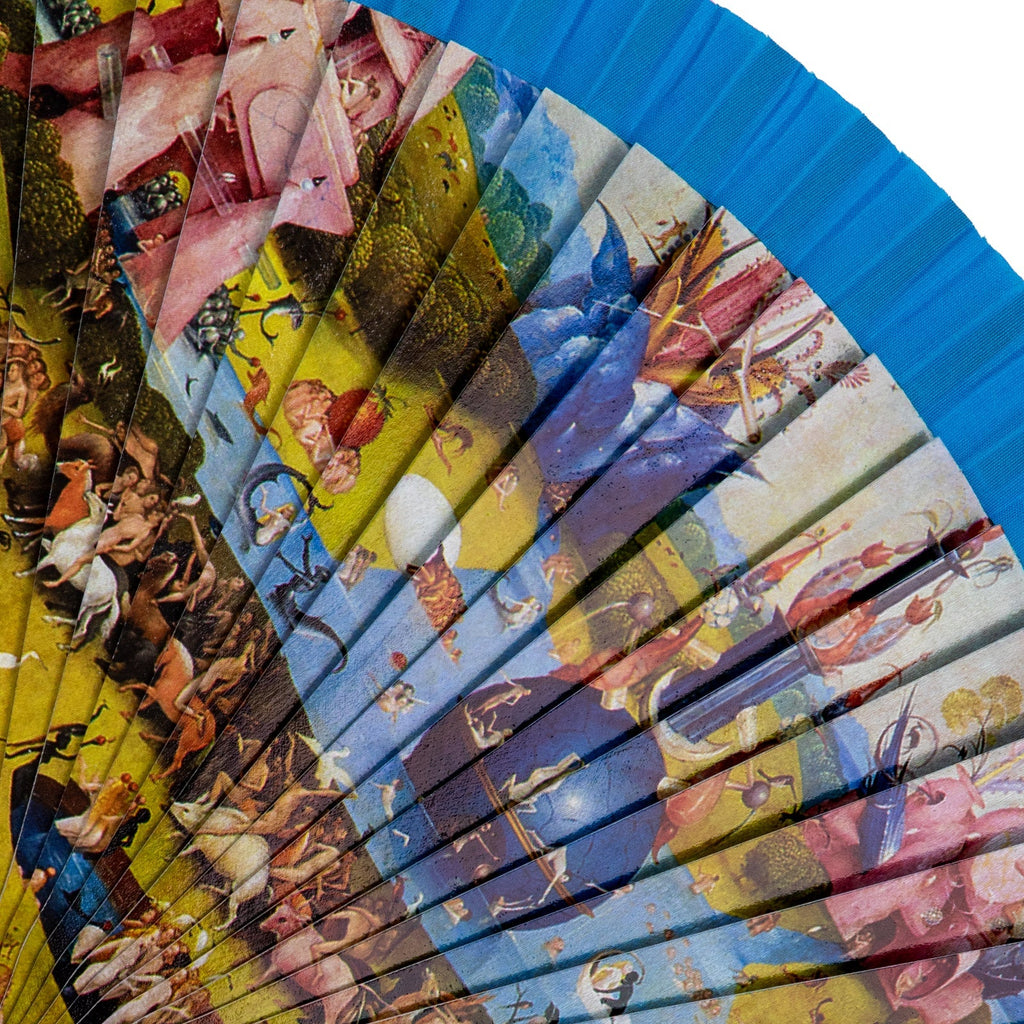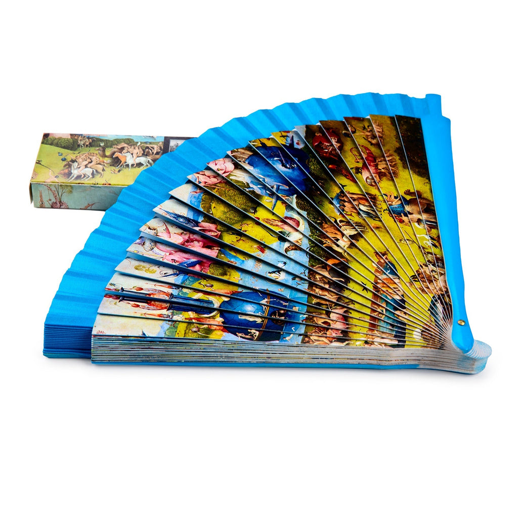 Abanico plegable de la colección El Bosco de Javier. Está fabricado con varillas de madera estampada y tela. El abanico viene presentado en un estuche de cartón con el mismo diseño, ¡perfecto para regalar!