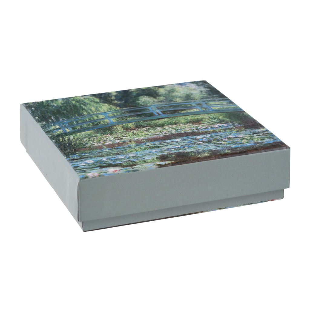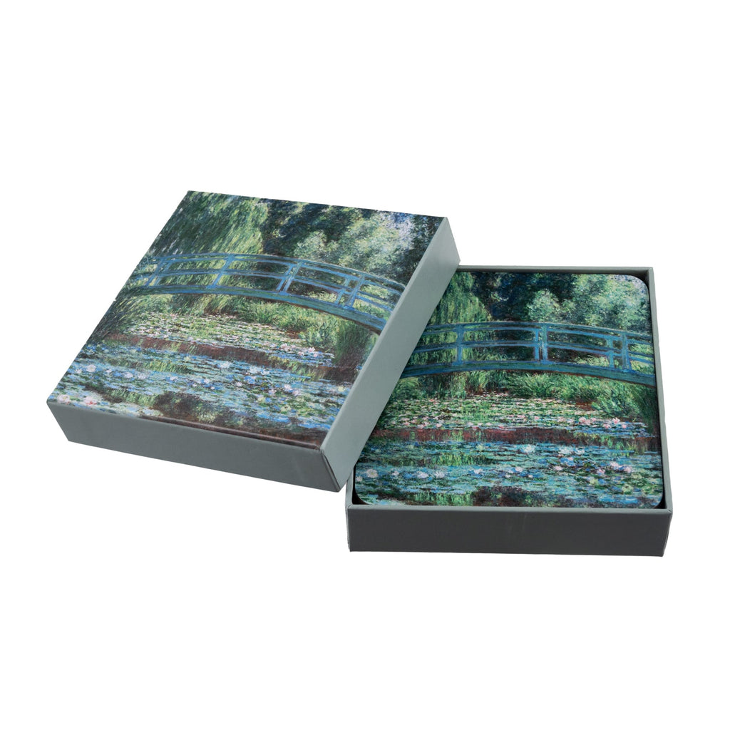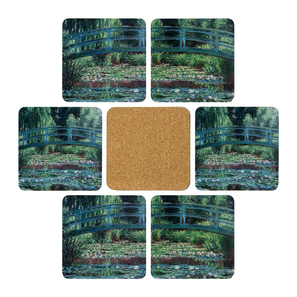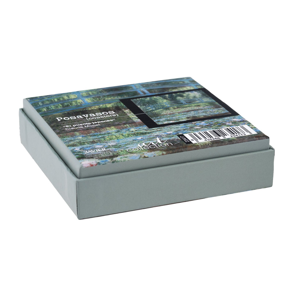 Juego de 6 posavasos cuadrados de 10 cm de la colección El Puente de Monet de Javier. Están fabricados en madera con base antideslizante de corcho y parte superior decorada. Vienen presentados en una caja de cartón, perfecta para guardarlos y decorar a la vez.