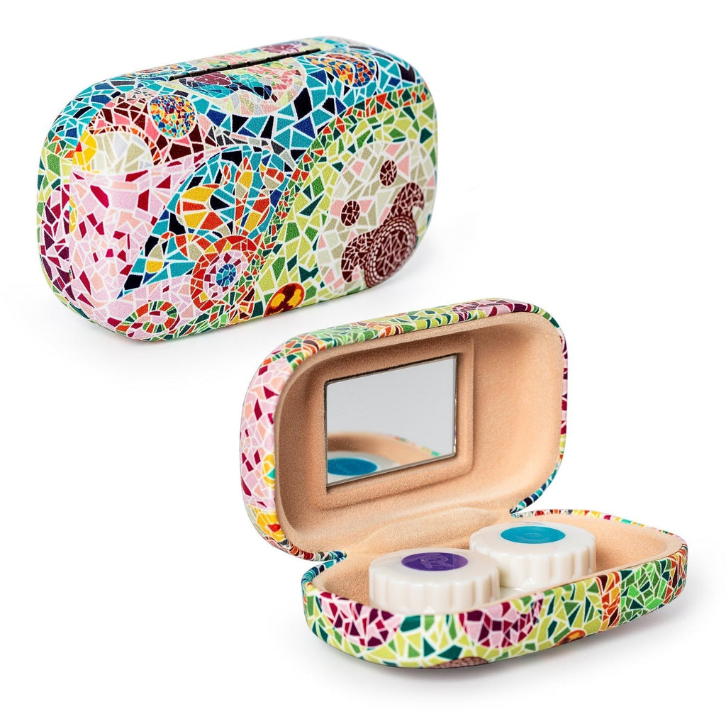 Estuche para lentes de contacto rígido de la colección Elementos de Javier con cierre flex. Viene provisto de un espejo interior y un porta lentillas de plástico. Es el formato ideal para que puedas llevarlo con seguridad de viaje o en el bolso.