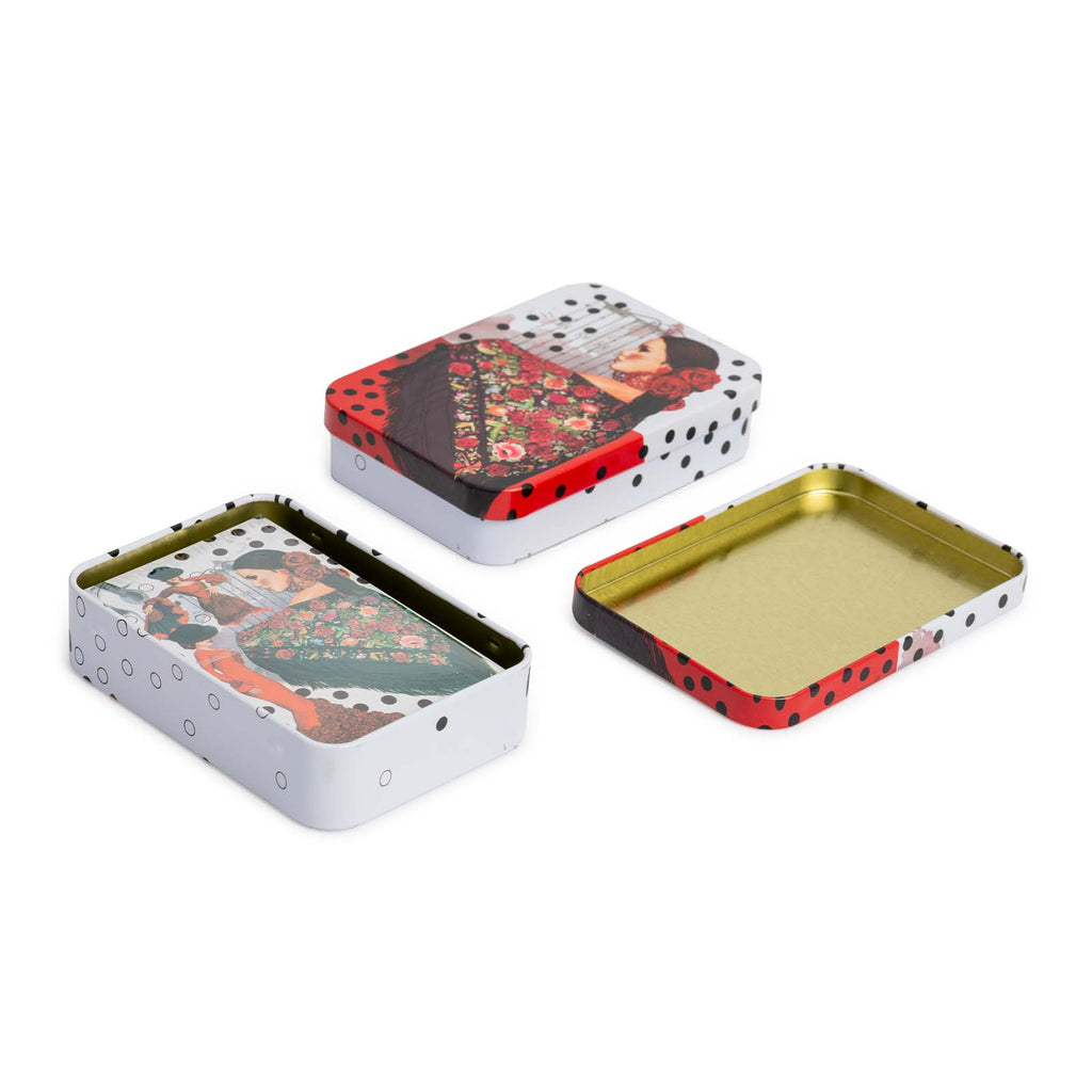 Se presentan en un estuche metálico con el mismo dibujo que el reverso de las cartas y cuenta con cierre a presión. Perfecto para que te puedas llevar tu baraja a cualquier lugar de forma segura.