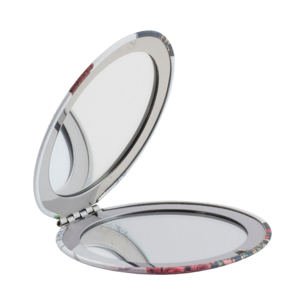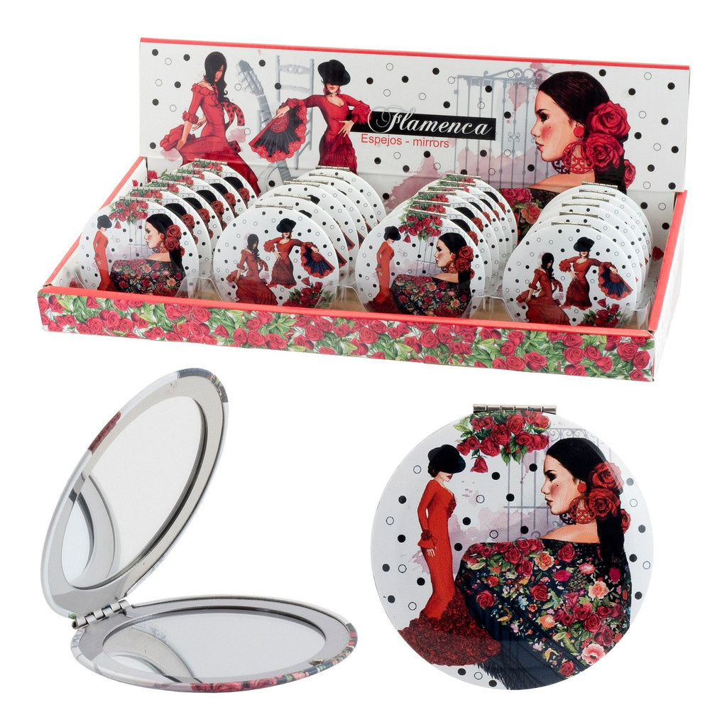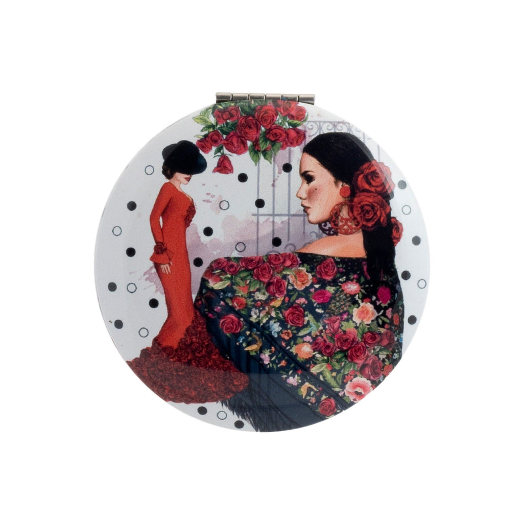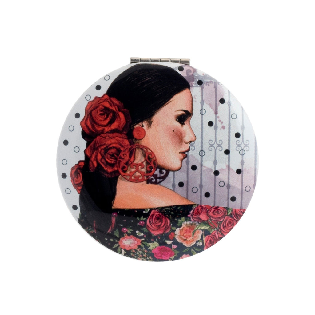 Espejo de bolsillo redondo de 7 cm con diseños inspirados en el flamenco, considerado uno de los bailes populares más reconocidos de España. El exterior está fabricado en acero, y es ideal para llevar a cualquier lugar sin que te ocupe nada de espacio.