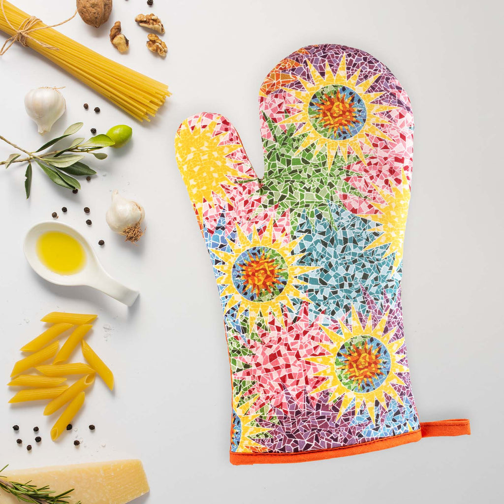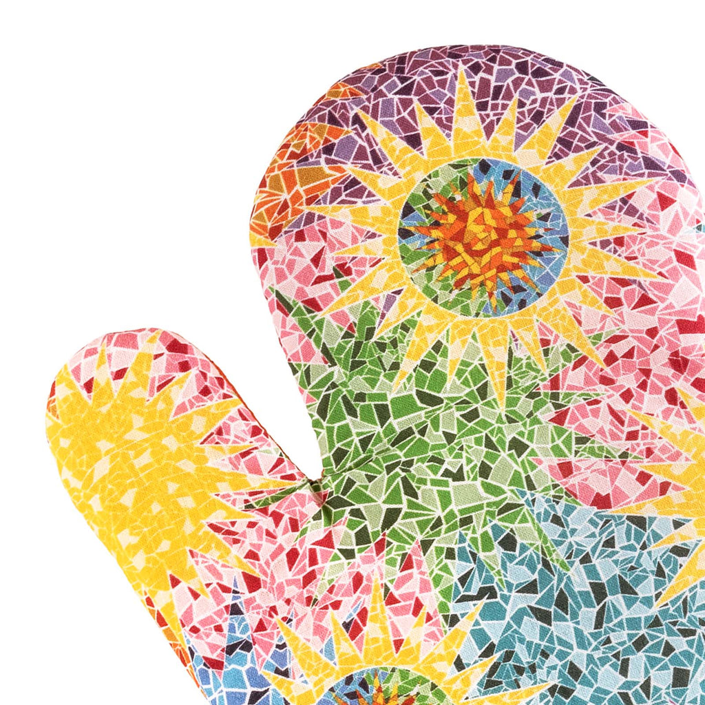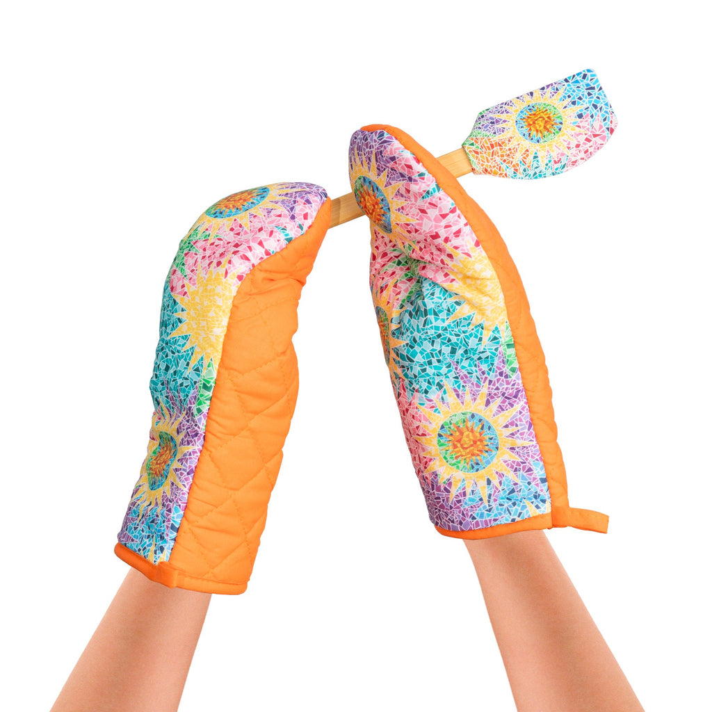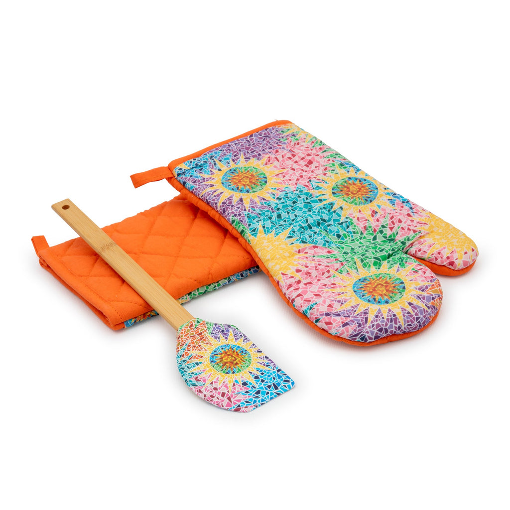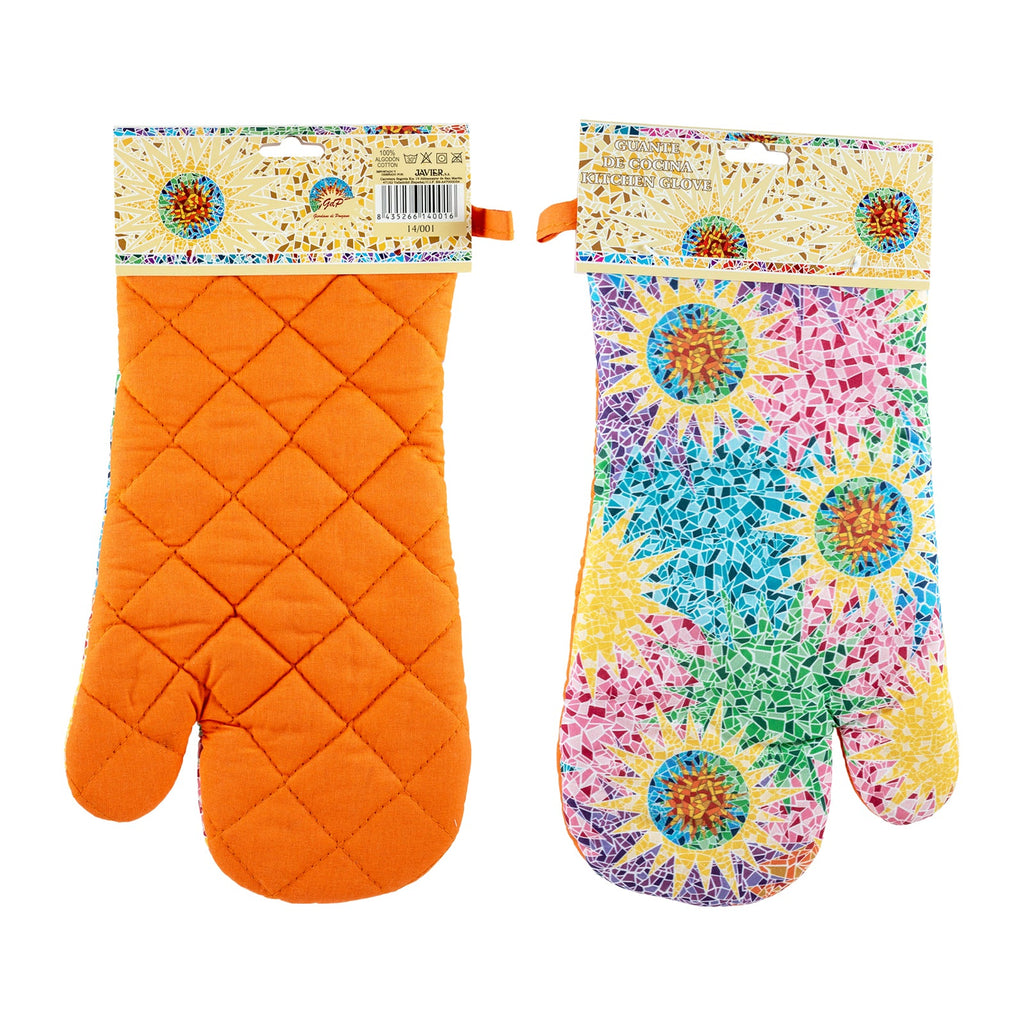 Juego de 2 guantes o manoplas de cocina JAVIER Gaudí fabricados en 100% algodón, perfectos para manipular el horno, barbacoas, etc. Ideales para proteger bien tus manos y muñecas de las quemaduras. Incluye espátula de silicona y mango de bambú a juego.