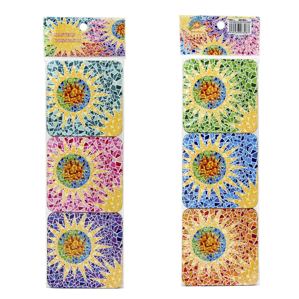 Juego de 6 posavasos cuadrados de 10 cm de la colección Gaudí de Javier. Están fabricados en madera con base antideslizante de corcho y parte superior impresa en distintos diseños.