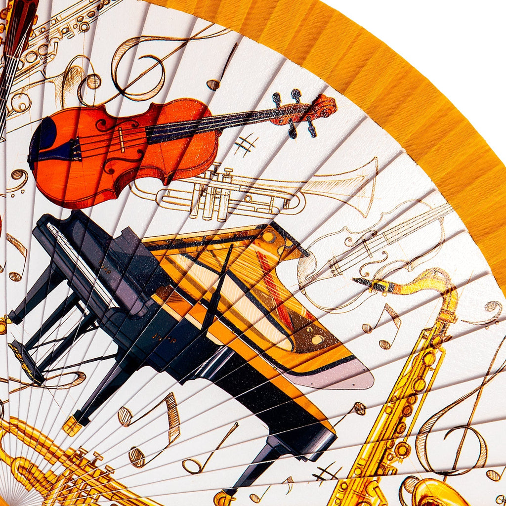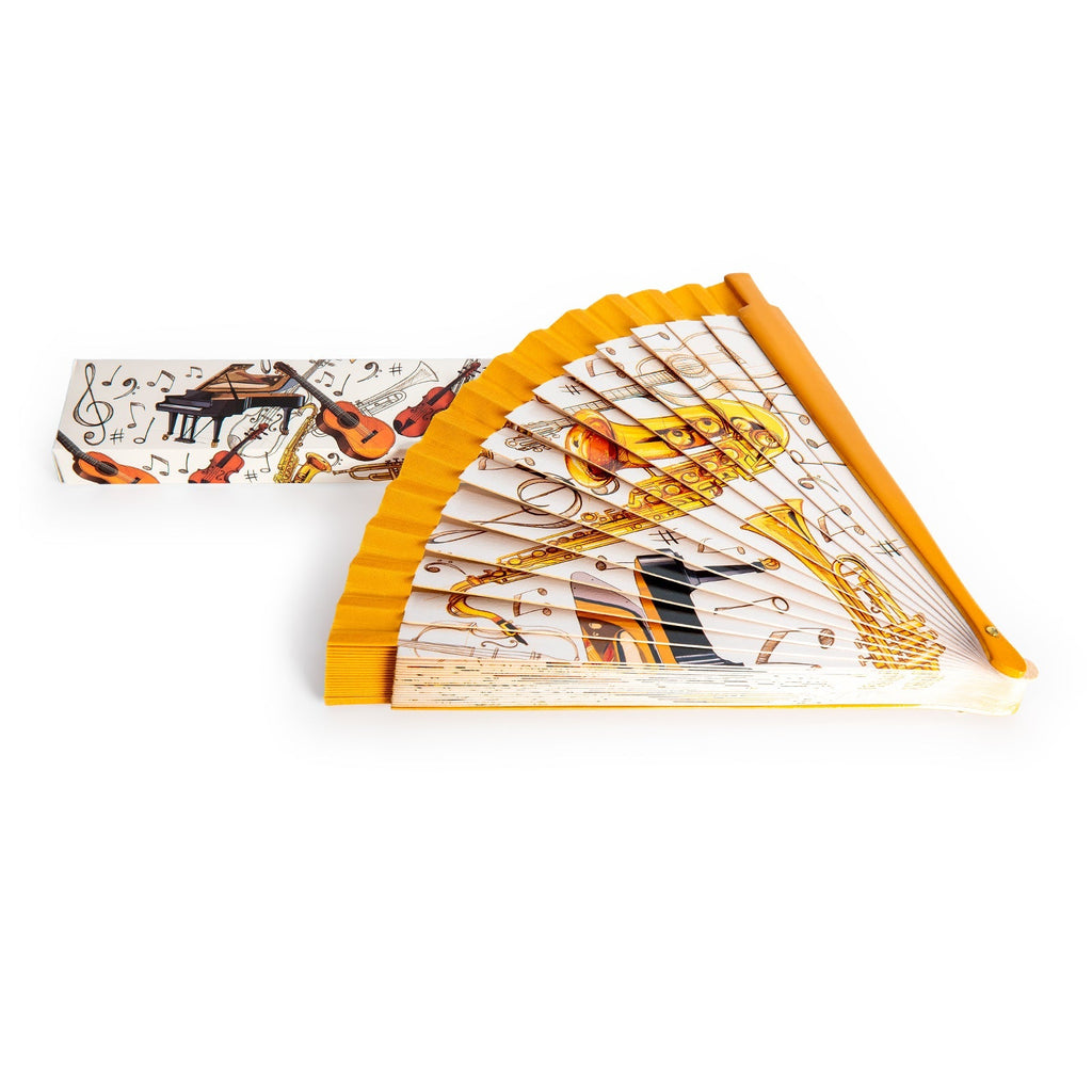 Abanico plegable de la colección Instrumentos de Javier. Está fabricado con varillas de madera estampada y tela. El abanico viene presentado en un estuche de cartón con el mismo diseño, ¡perfecto para regalar!