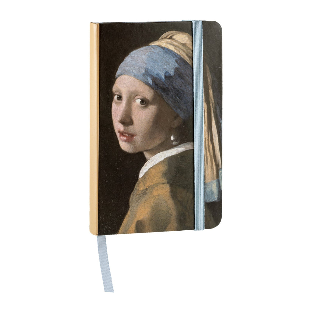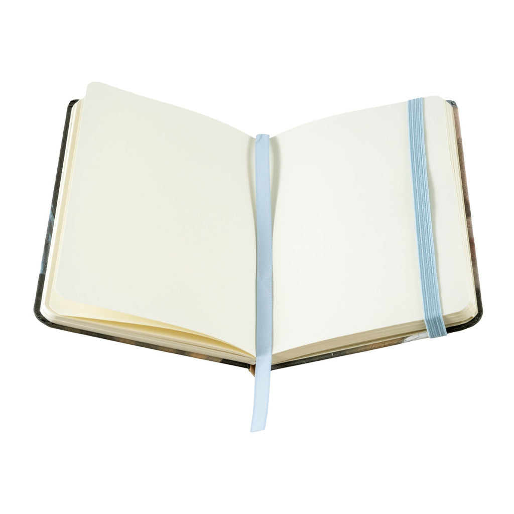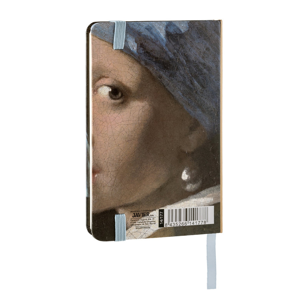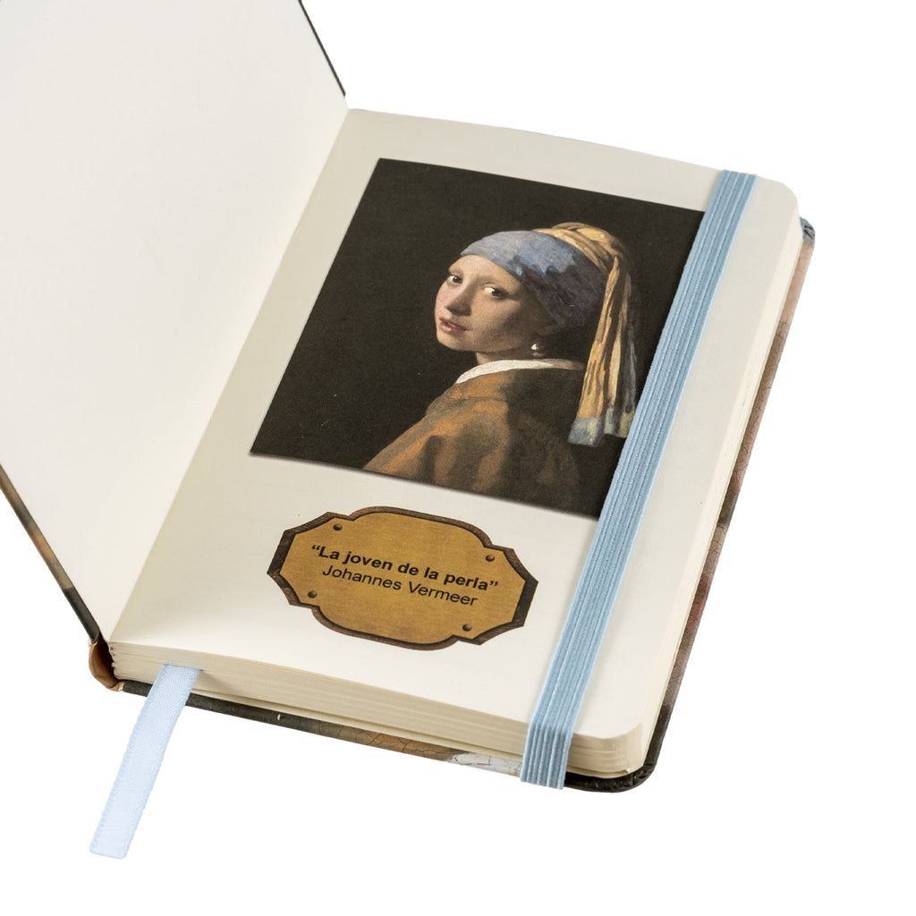 Libreta de notas en formato A6 JAVIER Joven Perla con cubiertas rígidas estampadas, cierre de goma y marca páginas de tela, perfecta para llevar contigo a cualquier lugar por su tamaño compacto y su practicidad.