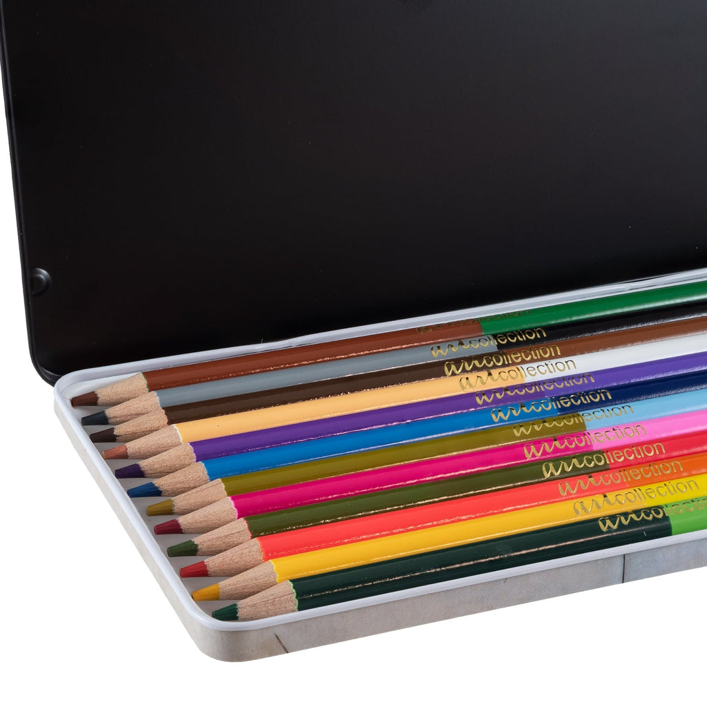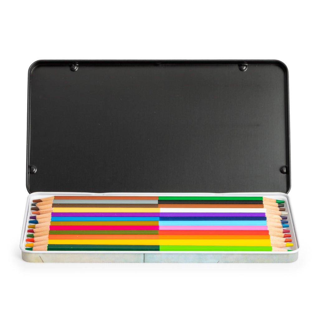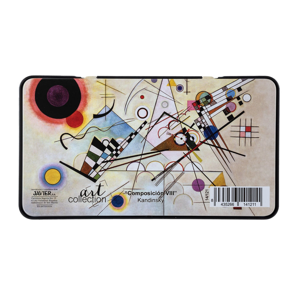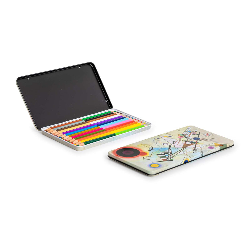 Caja metálica con 12 lápices de color con doble punta JAVIER Kandinski presentados en un estuche decorado con motivos de la colección. Están fabricados en madera y, al ser dobles, dispondrás de 24 colores vivos distintos en menos espacio.