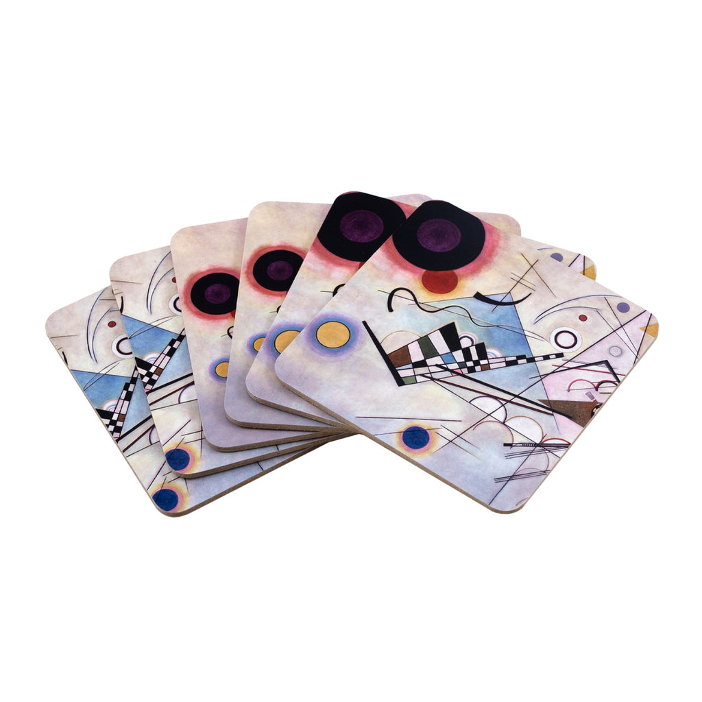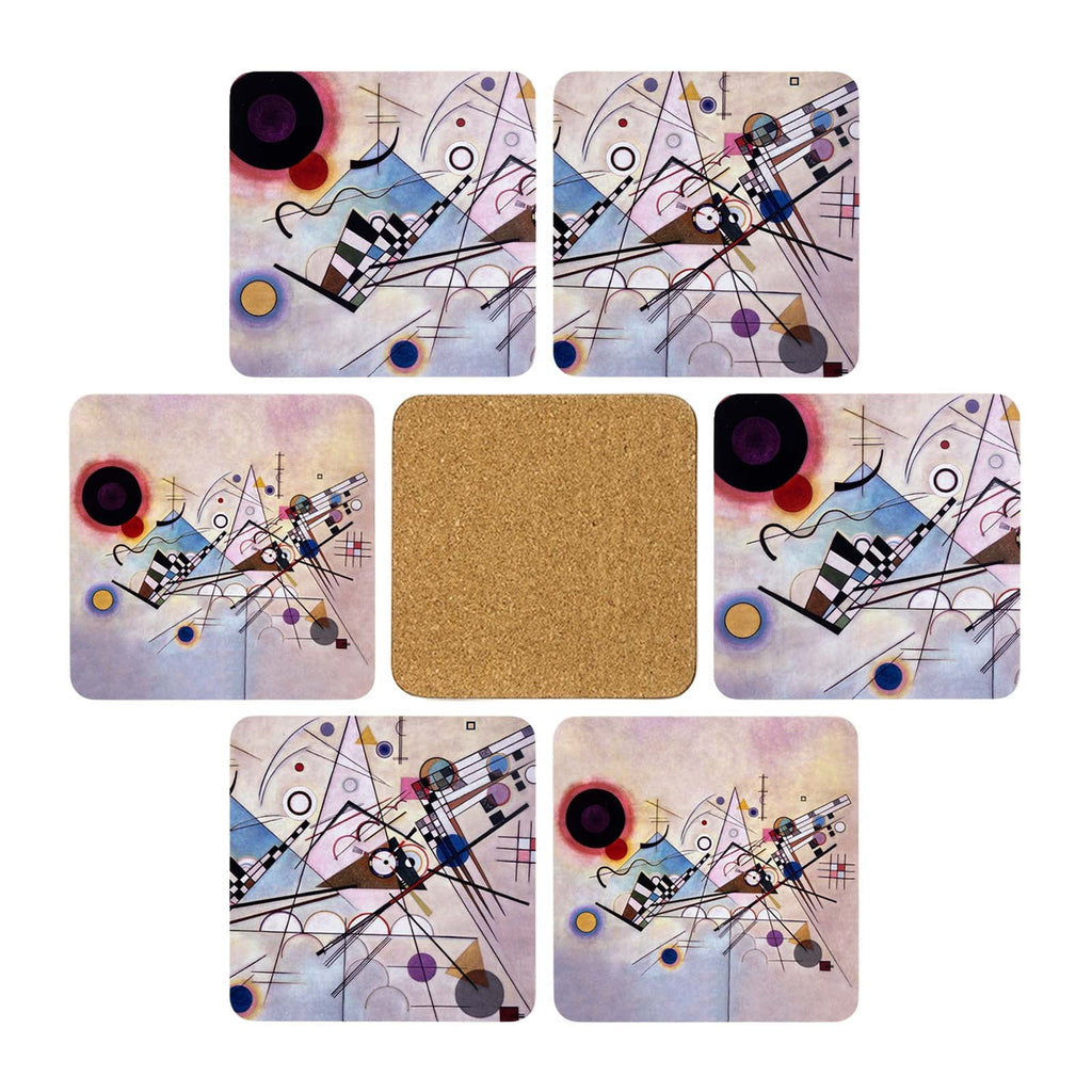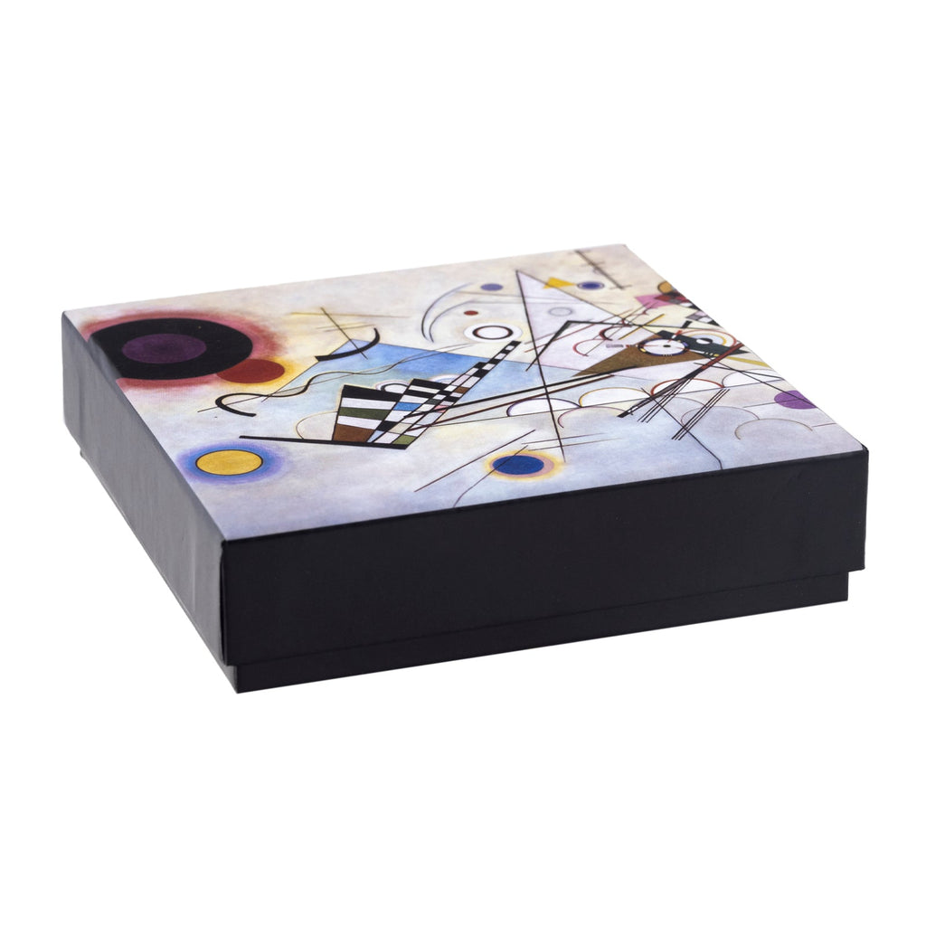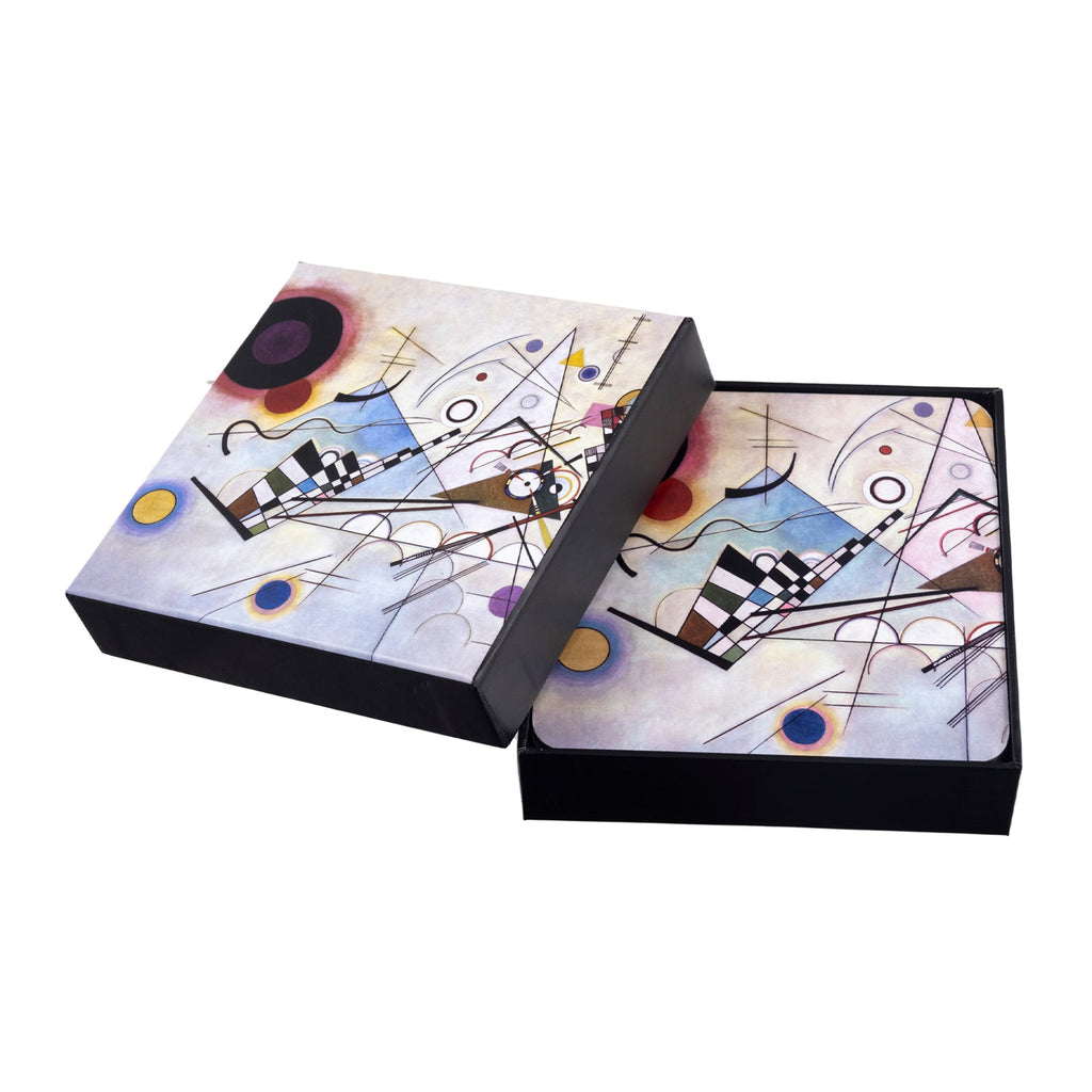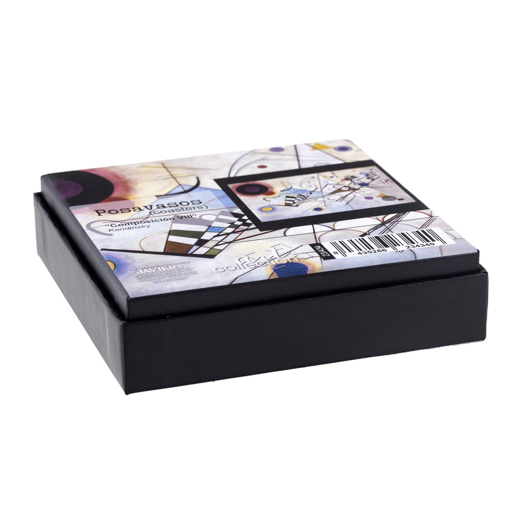 Juego de 6 posavasos cuadrados de 10 cm de la colección Kandinski de Javier. Están fabricados en madera con base antideslizante de corcho y parte superior decorada. Vienen presentados en una caja de cartón, perfecta para guardarlos y decorar a la vez.