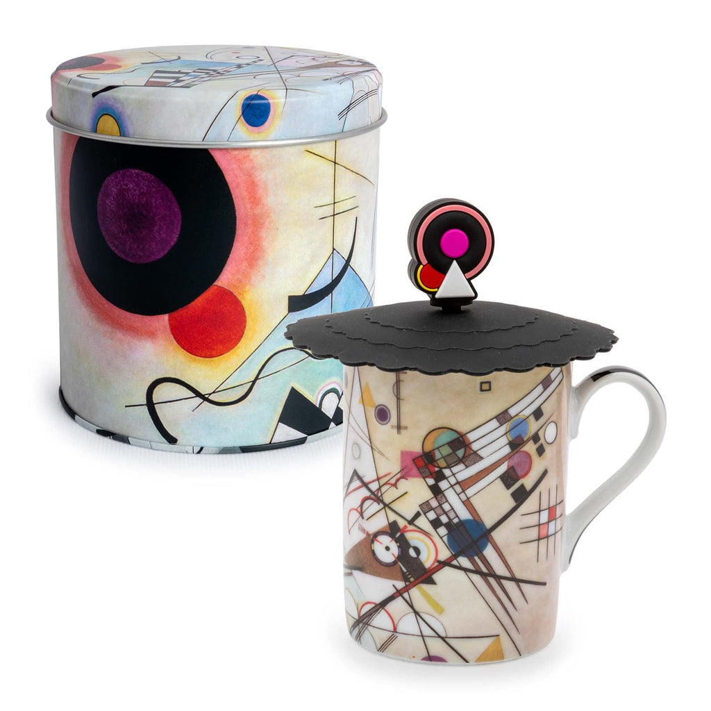 Taza para infusiones con tapa y filtro JAVIER Kandinski presentada en lata metálica, ideal para regalar. Incluye filtro metálico con agarradero donde podrás poner las hierbas a infusionar a granel sin que se mezclen con el agua.