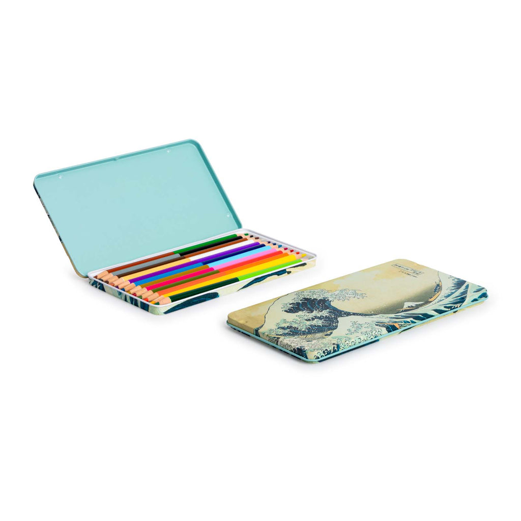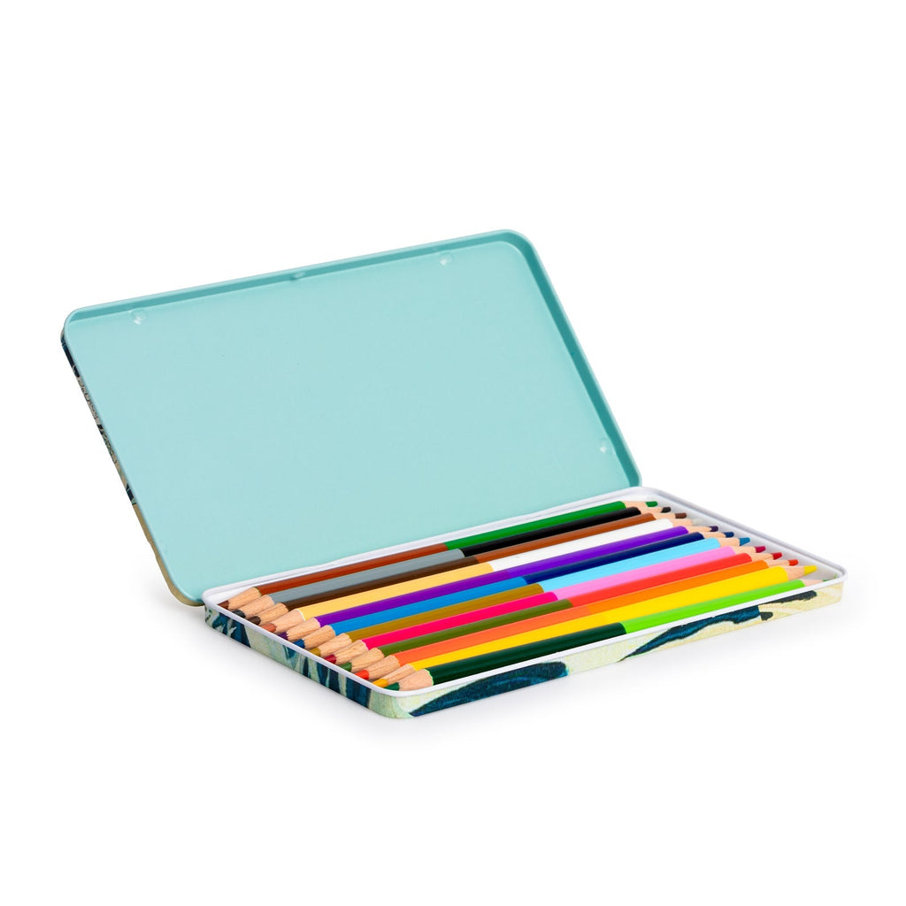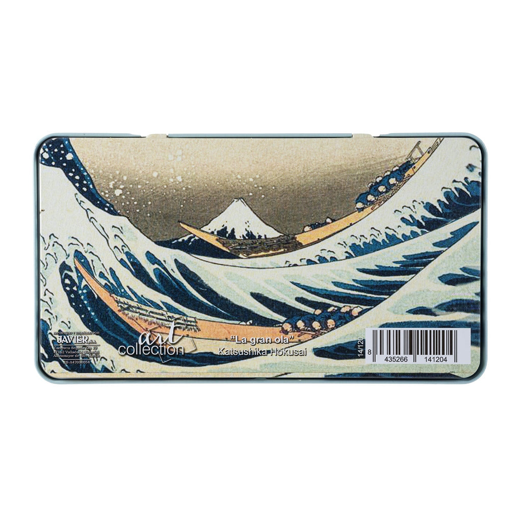 Caja metálica con 12 lápices de color con doble punta JAVIER La Ola presentados en un estuche decorado con motivos de la colección. Están fabricados en madera y, al ser dobles, dispondrás de 24 colores vivos distintos en menos espacio.