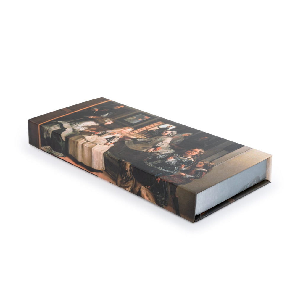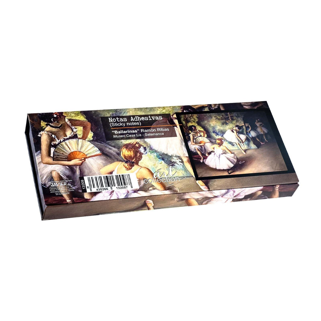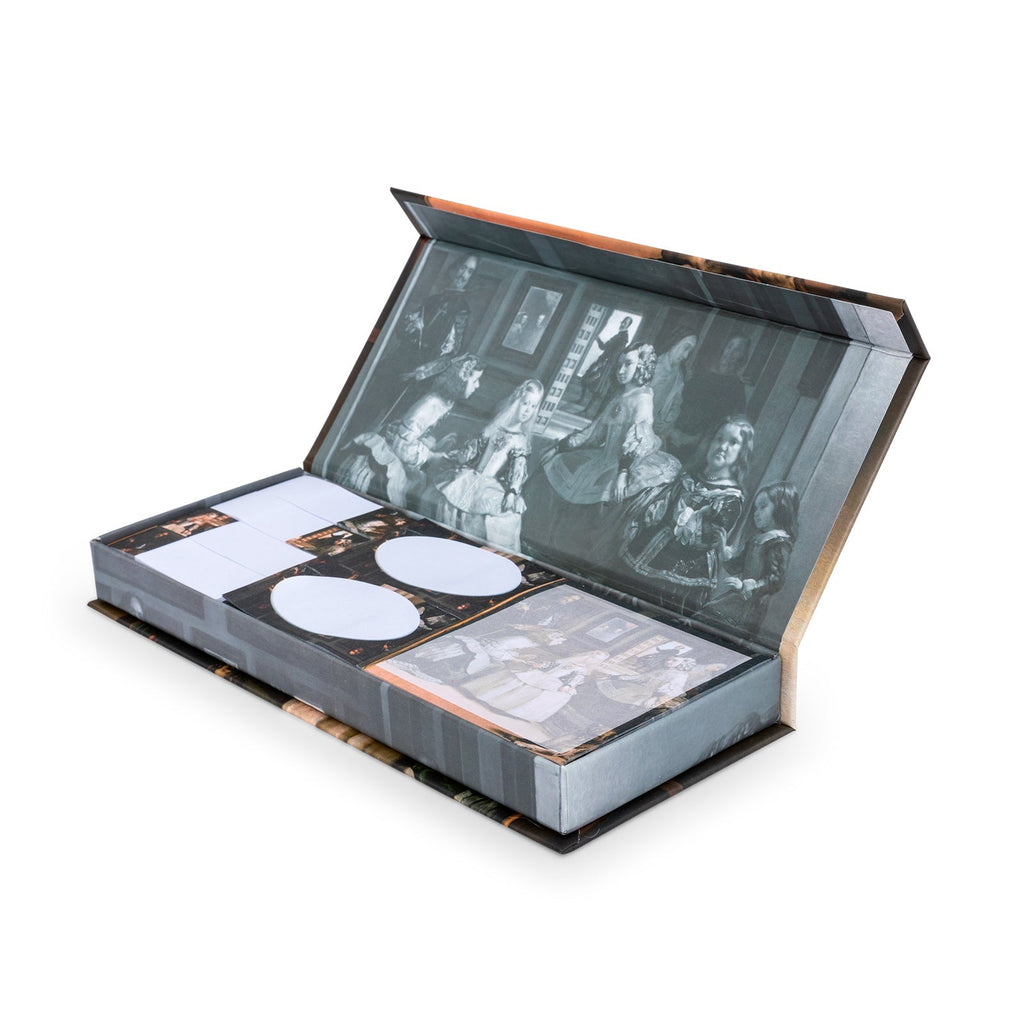 Set de notas adhesivas decoradas (formato Post-it) en caja de la colección El Beso, con cierre magnético. Las notas vienen en tres tamaños: pequeñas y rectangulares, ideales para usar como marcadores de página (4 blocs), medianas y rectangulares, para escribir un pequeño texto (2 blocs), y grandes y cuadradas tipo Post-it, para escribir notas más largas (1 bloc).