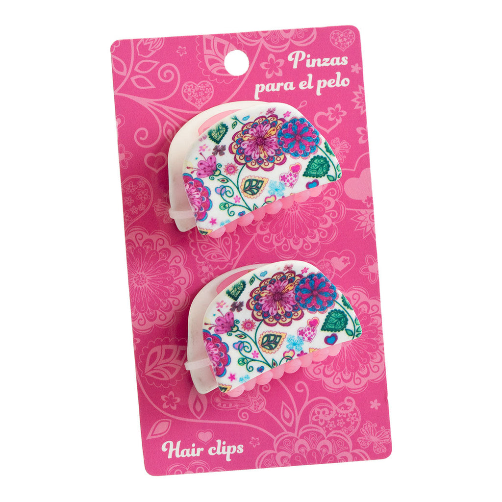 Conjunto de 2 pinzas para el cabello, fabricadas en plástico rígido de alta calidad con un diseño único decorado con coloridos motivos florales, con el acabado en soft touch, el cierre mandibular permite una sujeción segura, sin que la pinza se deslice, con un peso ligero.
