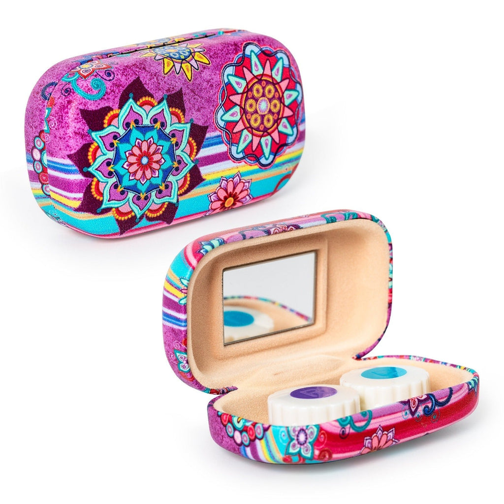Estuche para lentes de contacto rígido de la colección Mandalas de Javier con cierre flex. Viene provisto de un espejo interior y un porta lentillas de plástico. Es el formato ideal para que puedas llevarlo con seguridad de viaje o en el bolso.