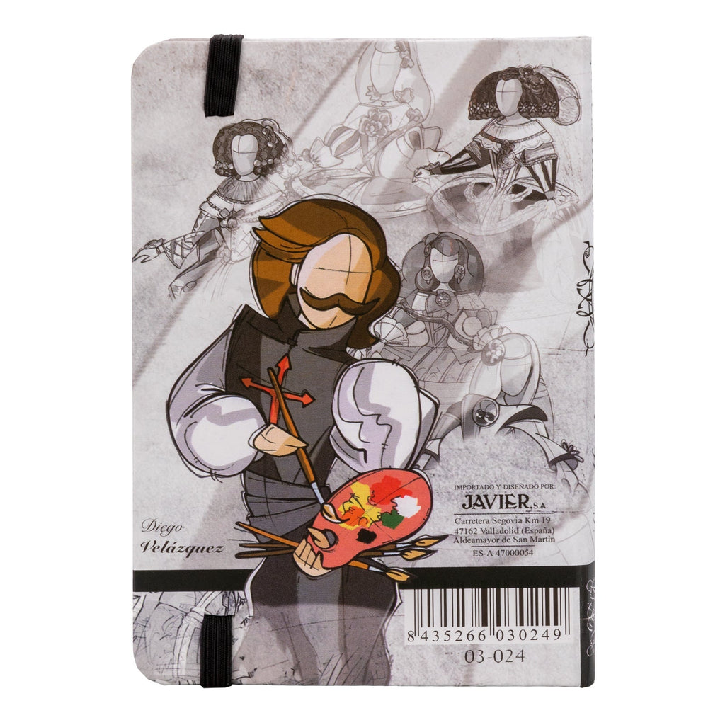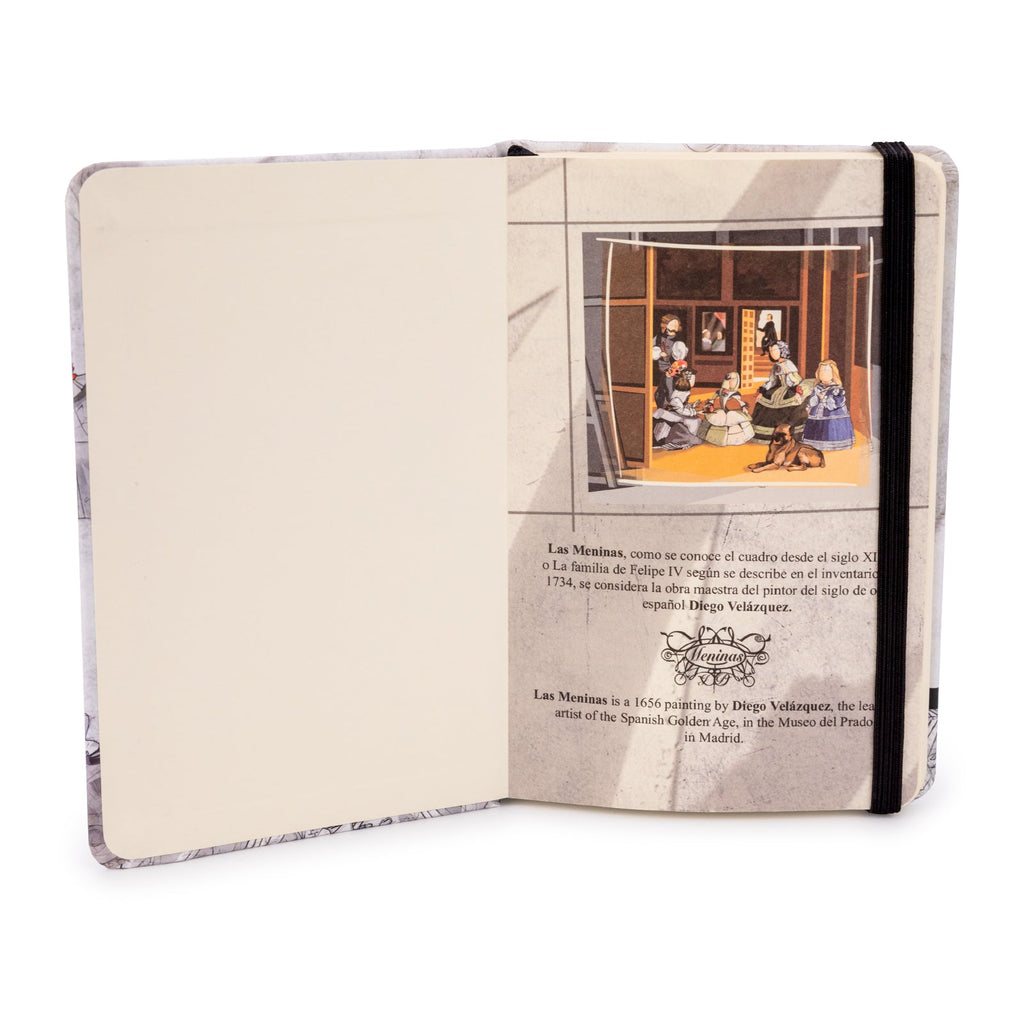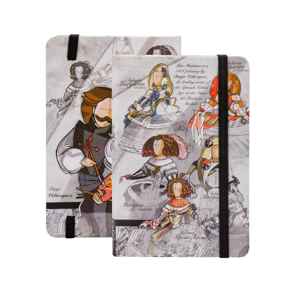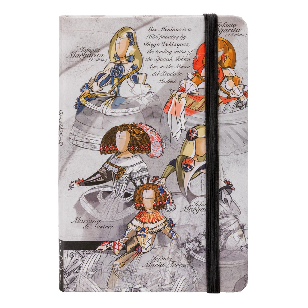 Libreta de notas en formato A6 JAVIER Meninas con cubiertas rígidas estampadas, cierre de goma y marca páginas de tela, perfecta para llevar contigo a cualquier lugar por su tamaño compacto y su practicidad.