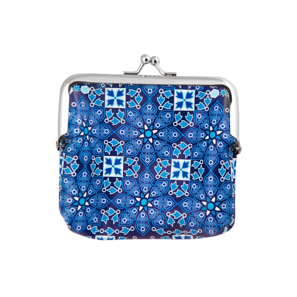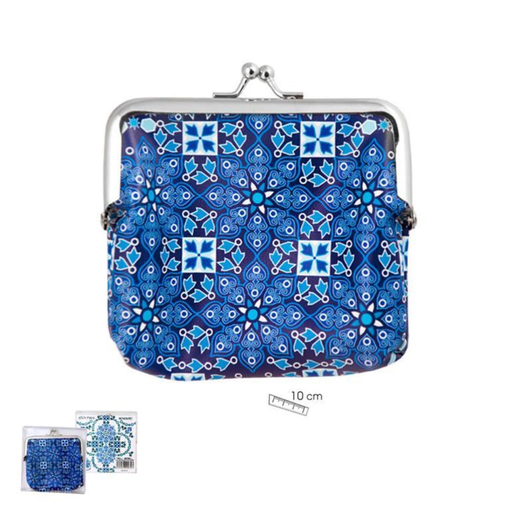 Monedero porta-monedas pequeño y compacto con cierre de clip, fabricado en poliéster, con un diseño único e innovador decorado con coloridos motivos arabesques en tonos azules. Un complemento robusto y resistente, con la capacidad de aguantar notoriamente el desgaste.