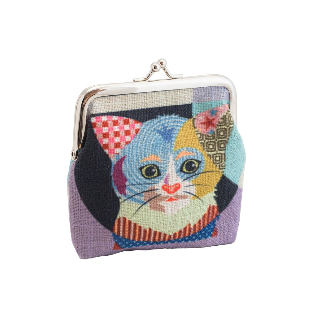Monedero porta-monedas pequeño y compacto con cierre de clip, fabricado en poliéster, con un diseño único e innovador decorado con coloridos motivos felinos. Un complemento robusto y resistente, con la capacidad de aguantar notoriamente el desgaste.