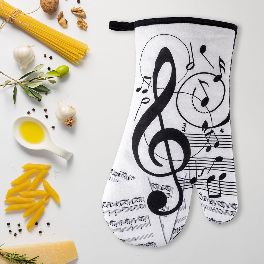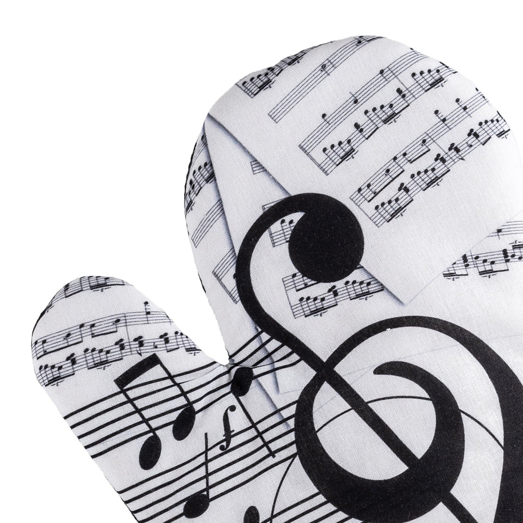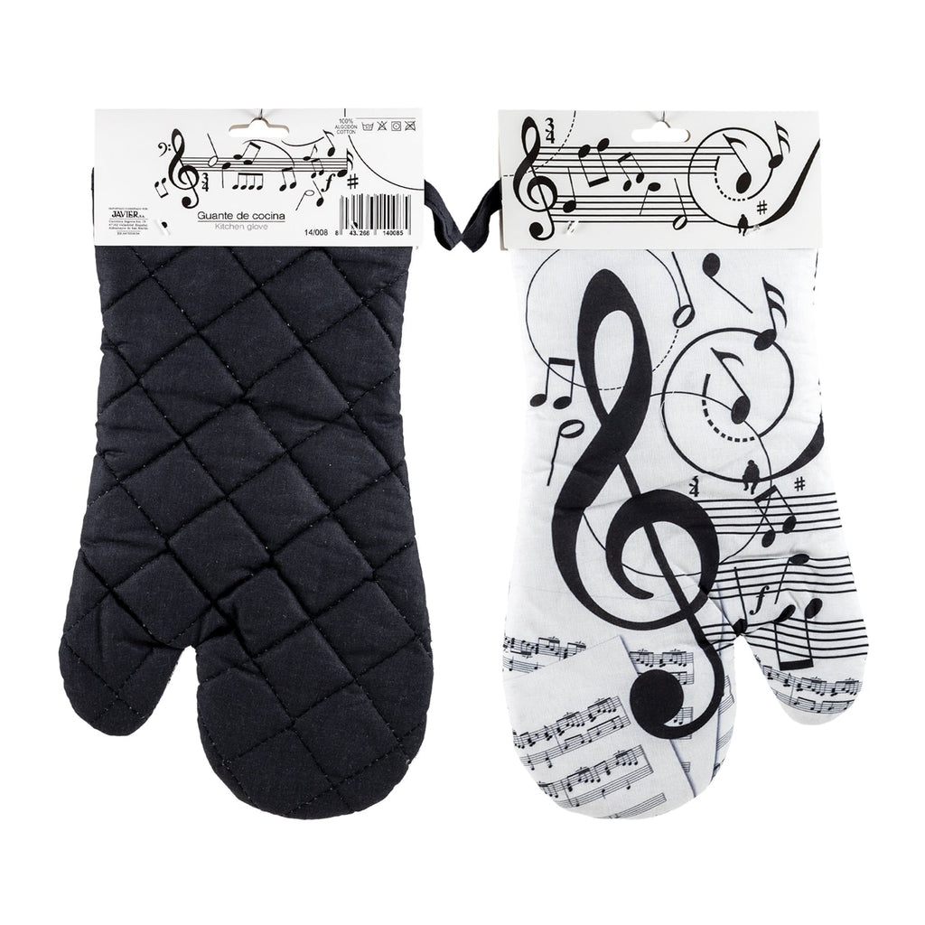 Juego de 2 guantes o manoplas de cocina JAVIER Música fabricados en 100% algodón, perfectos para manipular el horno, barbacoas, etc. Ideales para proteger bien tus manos y muñecas de las quemaduras. Incluye espátula de silicona y mango de bambú a juego.