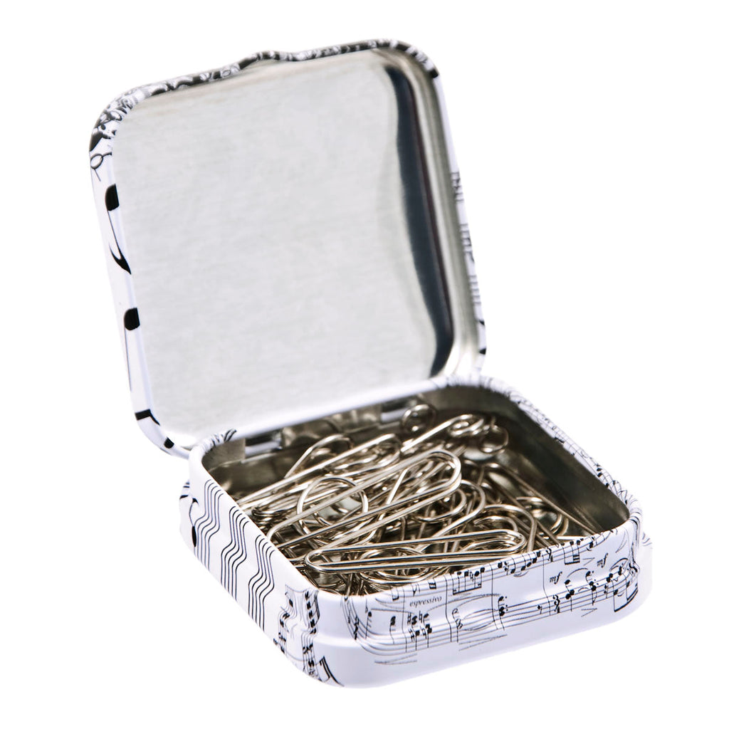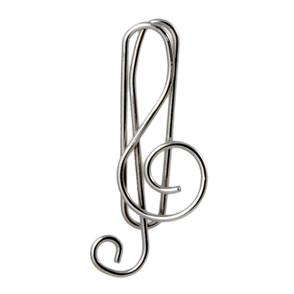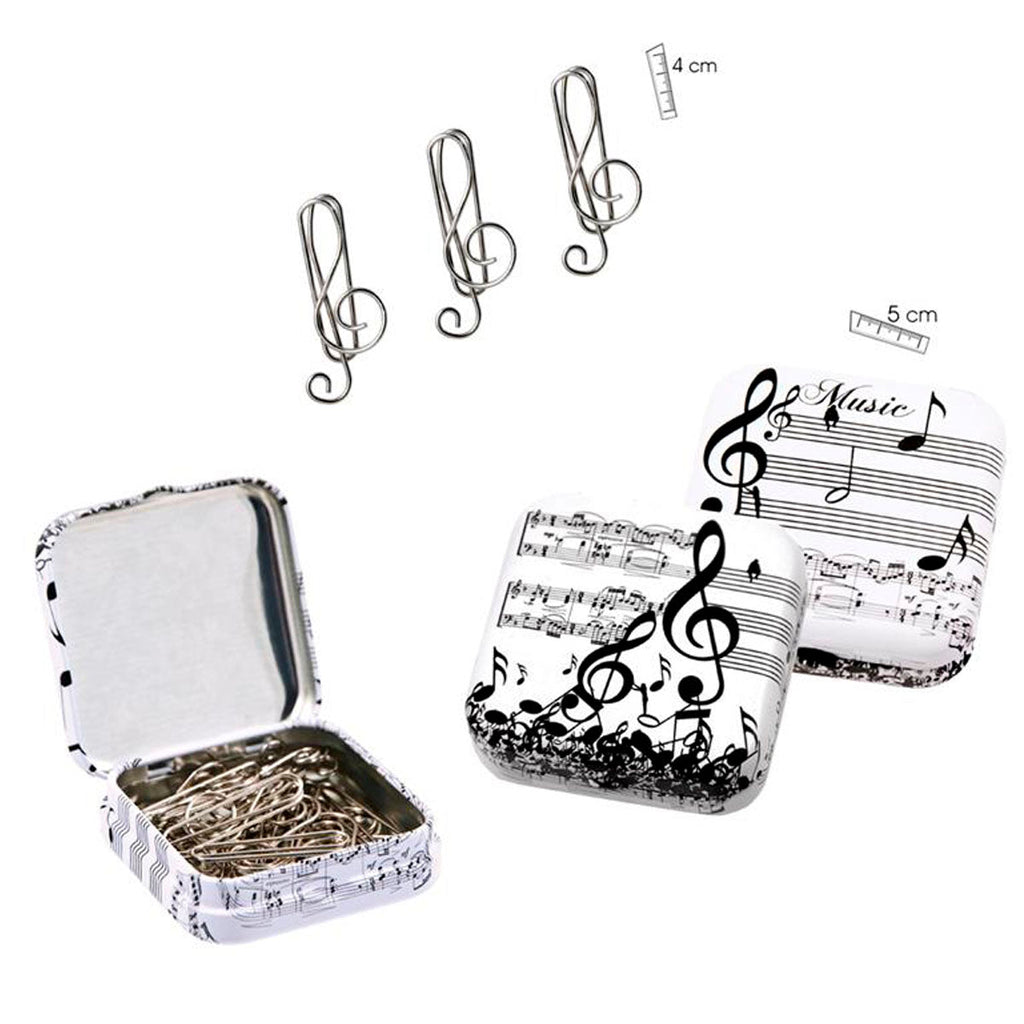 Set de 12 clips para papel con forma de clave de sol de la colección Música de Javier. Gracias a su flexibilidad puede sujetar un número considerable de hojas. Presentados en una cómoda caja de metal con cierre a presión, para que los puedas tener siempre a mano y no perderlos.