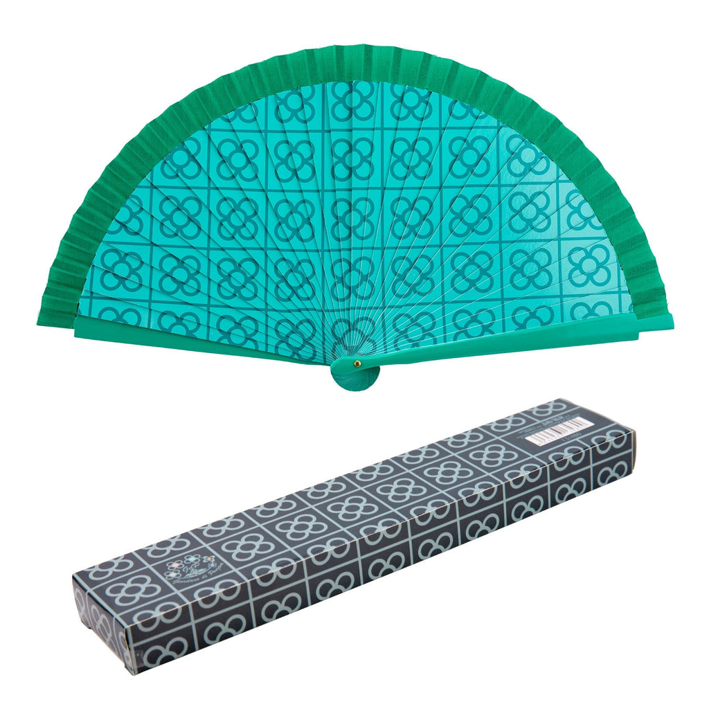 Abanico plegable de la colección Panot de Javier. Está fabricado con varillas de madera estampada y tela. El abanico viene presentado en un estuche de cartón con el mismo diseño, ¡perfecto para regalar!