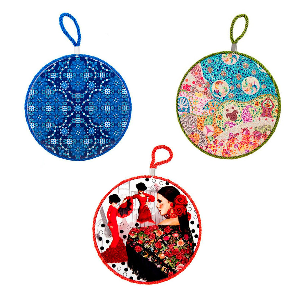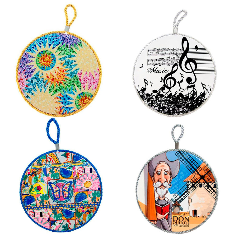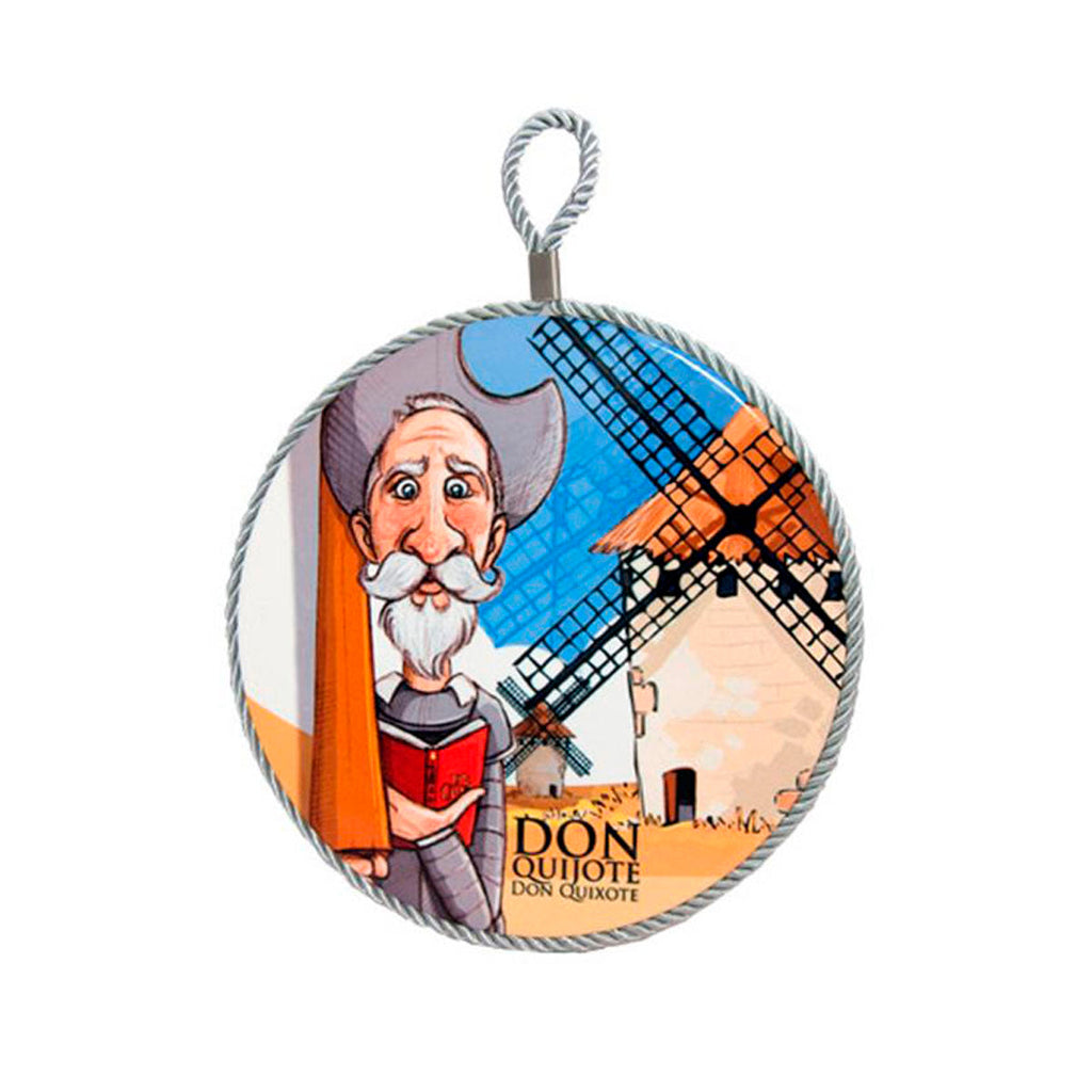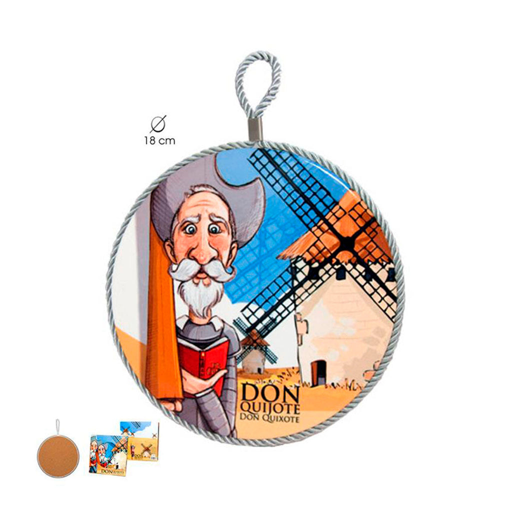 Salva mantel protector de superficies redondo con un diseño único decorado con motivos inspirados en el pintoresco personaje Don Quijote de Cervantes y diseñado por Giordano di Ponzano. Un elemento indispensable para dar un toque personal a tu hogar.