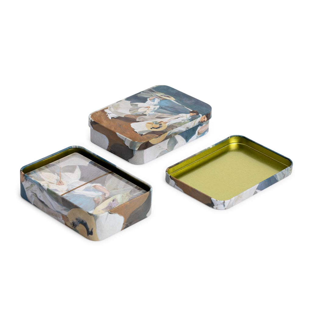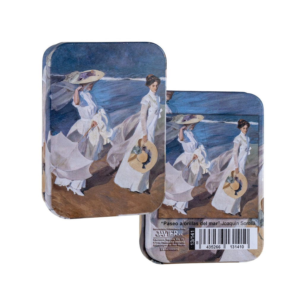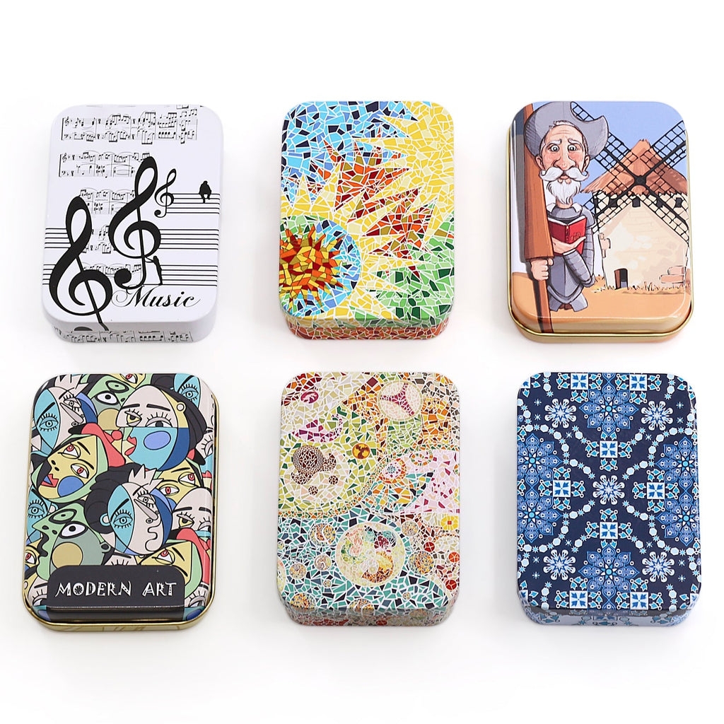 Se presentan en un estuche metálico con el mismo dibujo que el reverso de las cartas y cuenta con cierre a presión. Perfecto para que te puedas llevar tu baraja a cualquier lugar de forma segura.