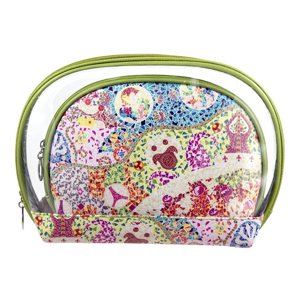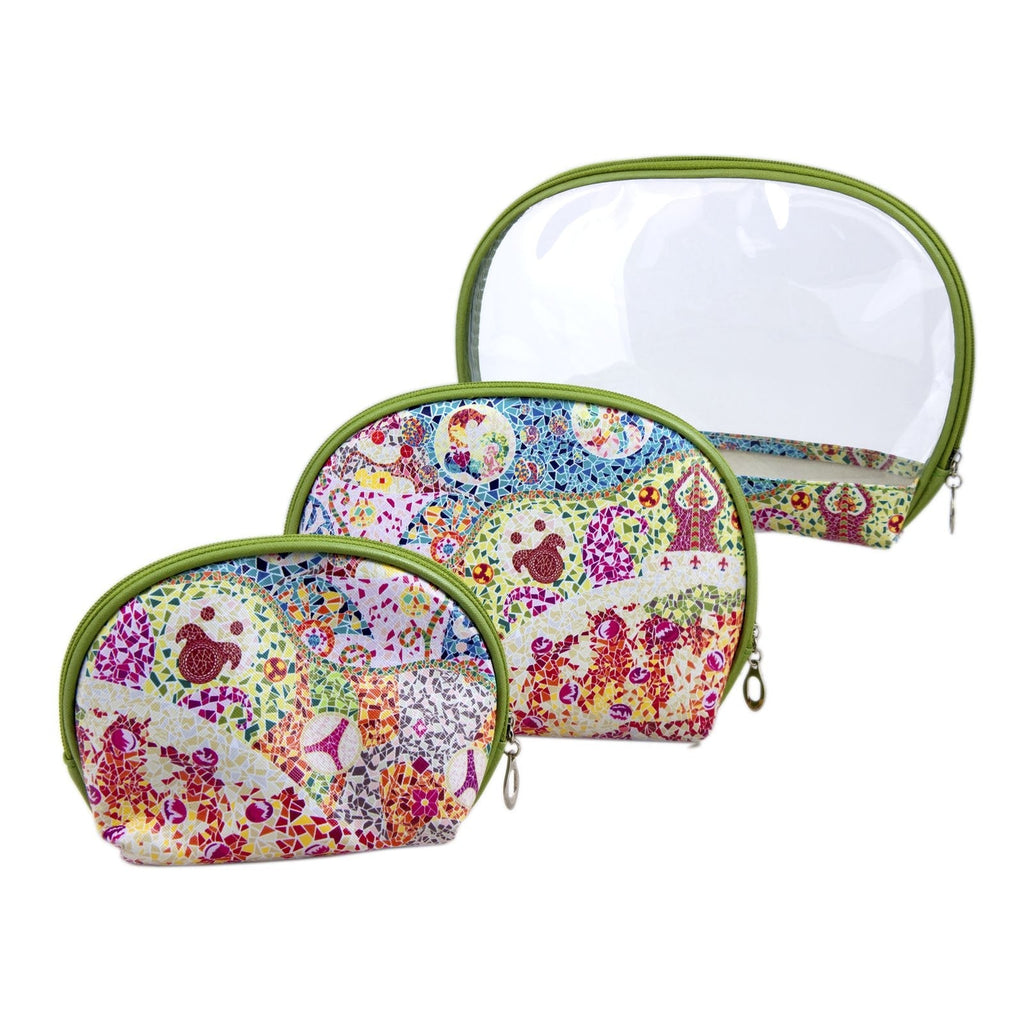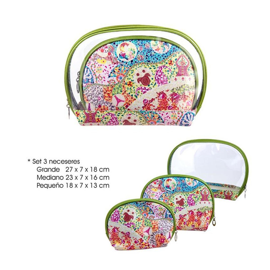 Set de 3 neceseres ovalados de distintos tamaños con cierre de cremallera de alta calidad y diseño modernista decorado con motivos trencadís, inspirados en Gaudí. Sus medidas permiten guardar uno dentro del otro para que ocupen menos espacio al guardarlos.