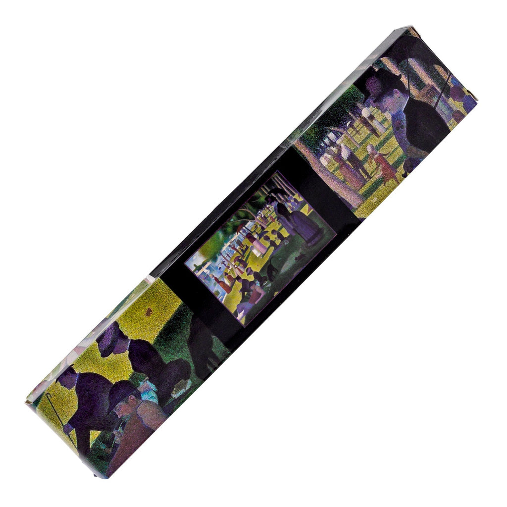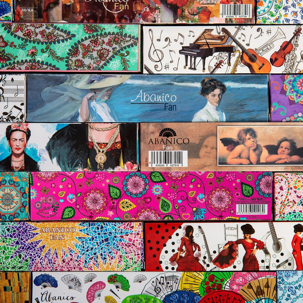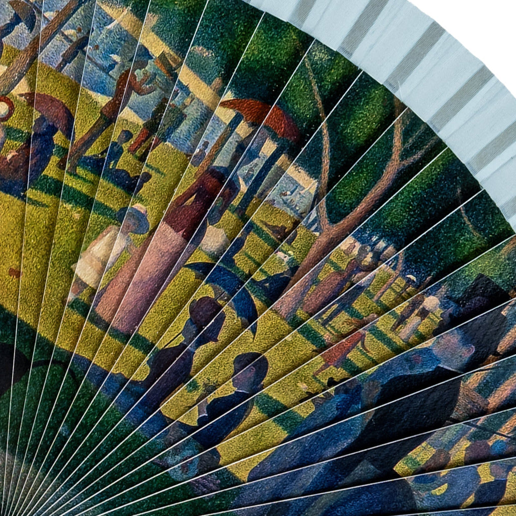 Abanico plegable de la colección Seurat de Javier. Está fabricado con varillas de madera estampada y tela. El abanico viene presentado en un estuche de cartón con el mismo diseño, ¡perfecto para regalar!