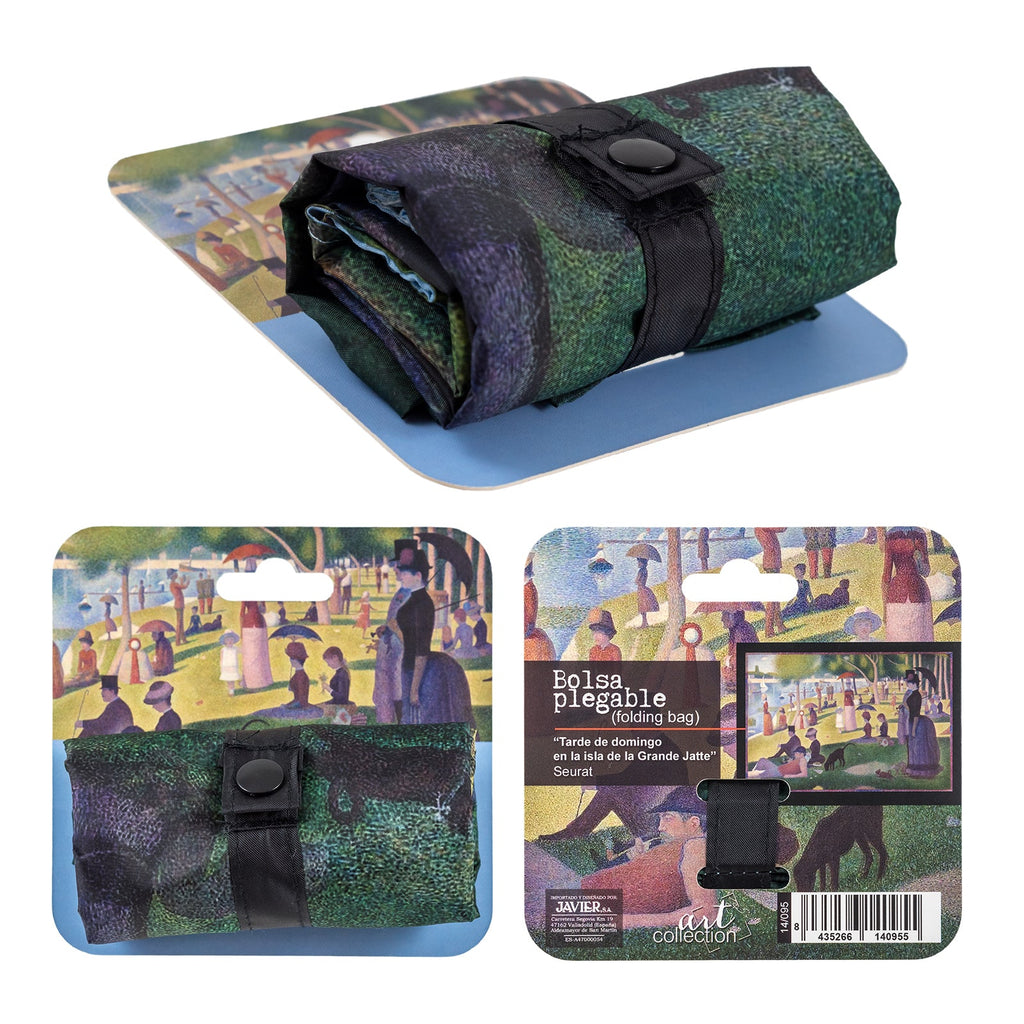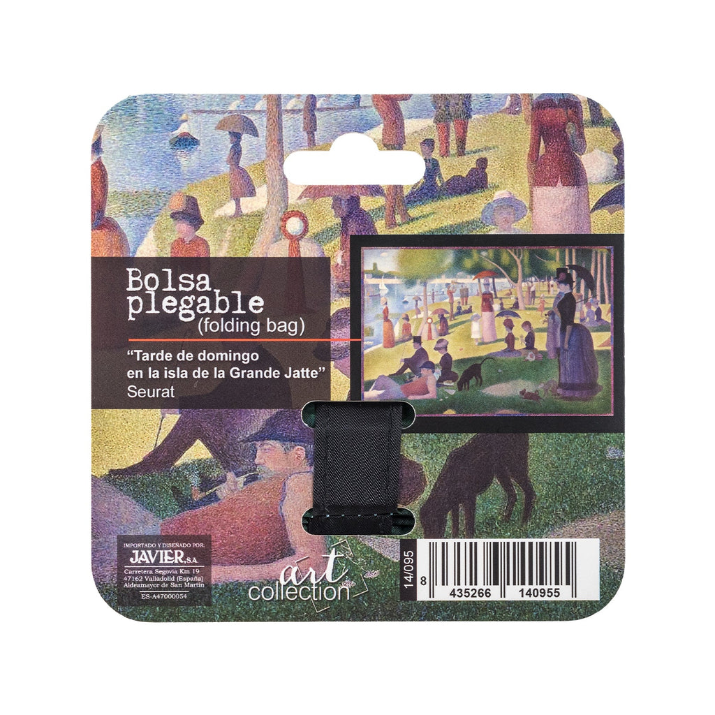 Bolsa plegable y reutilizable de la colección Seurat de Javier. Al tener un tamaño reducido cuando está plegada, es ideal para llevarla siempre contigo a cualquier lugar: a la compra, en el coche, en el bolso, etc. y ¡dar un toque de color a tus días!