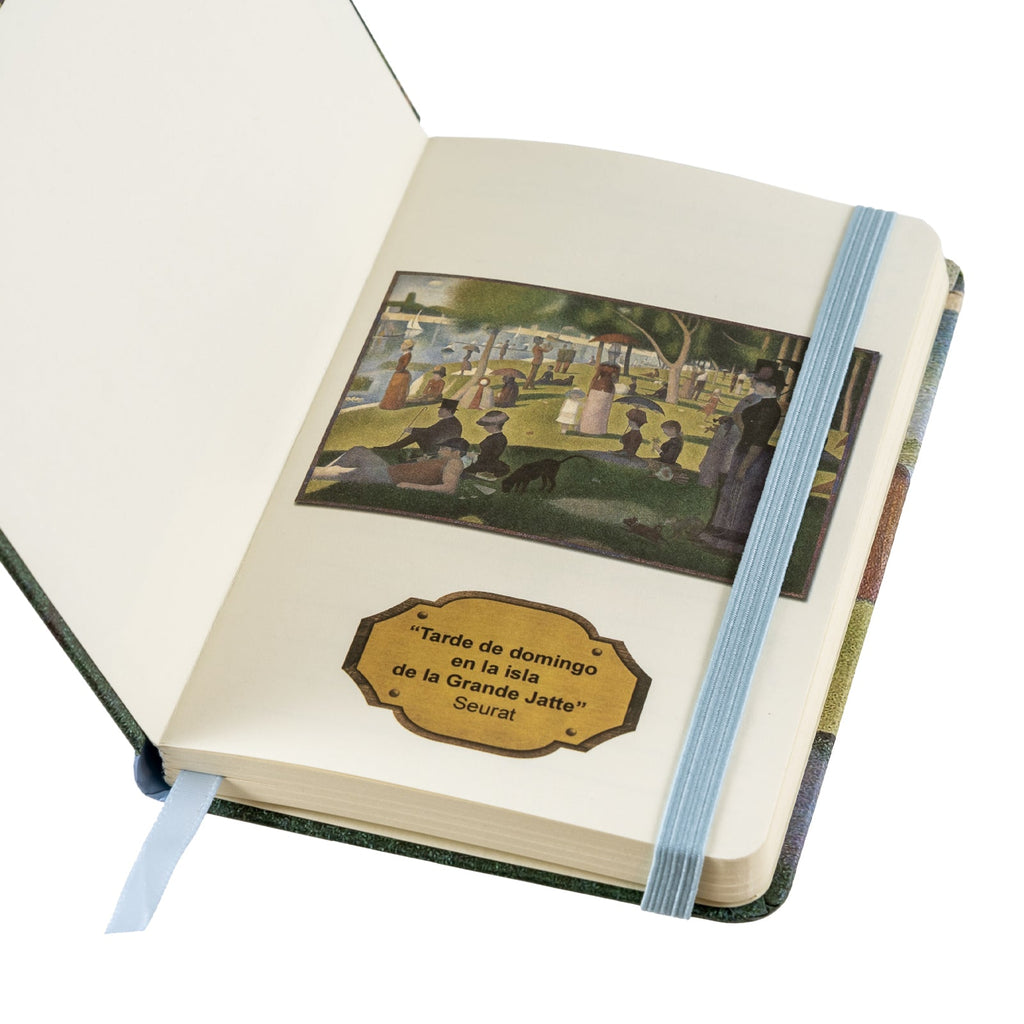 Libreta de notas en formato A6 JAVIER Seurat con cubiertas rígidas estampadas, cierre de goma y marca páginas de tela, perfecta para llevar contigo a cualquier lugar por su tamaño compacto y su practicidad.