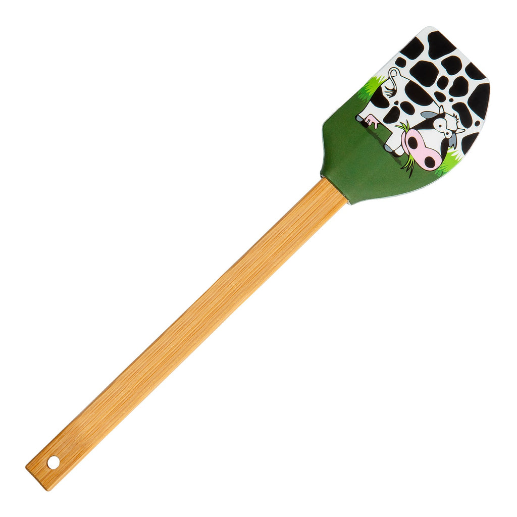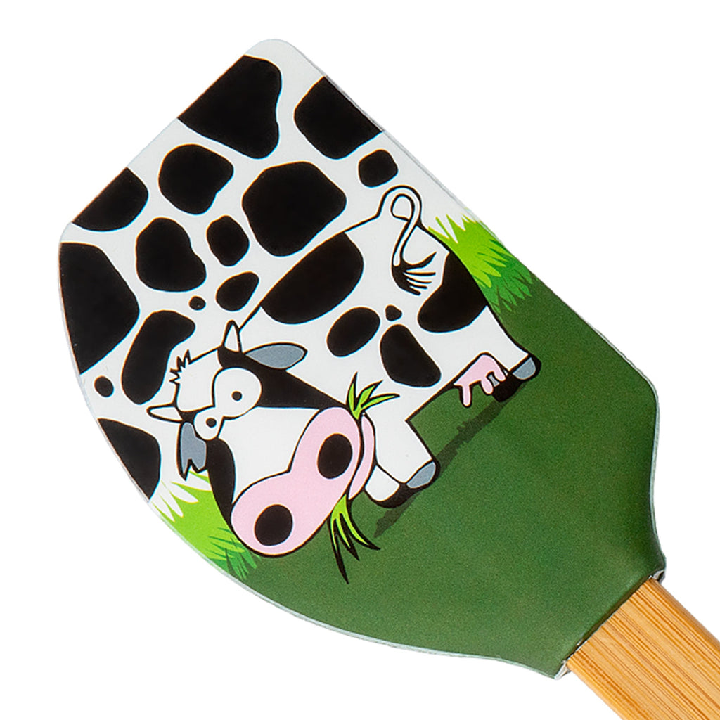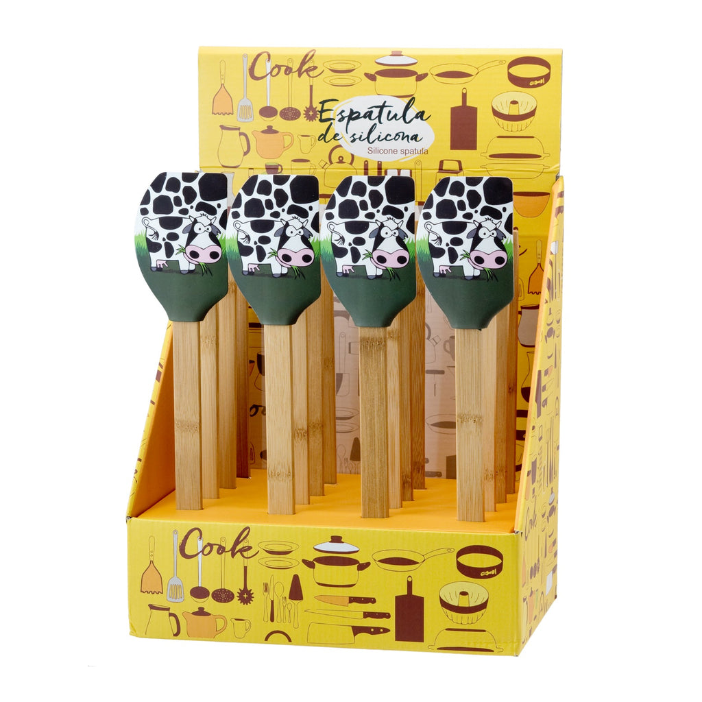 Espátula de cocina tipo lengua de gato de la colección Vaca de Javier. Está fabricada en silicona con mango de bambú, materiales muy resistentes, por lo que es un utensilio perfecto para tu día a día.