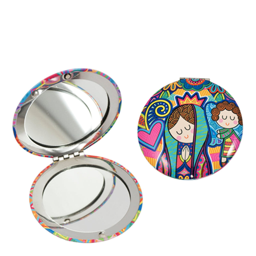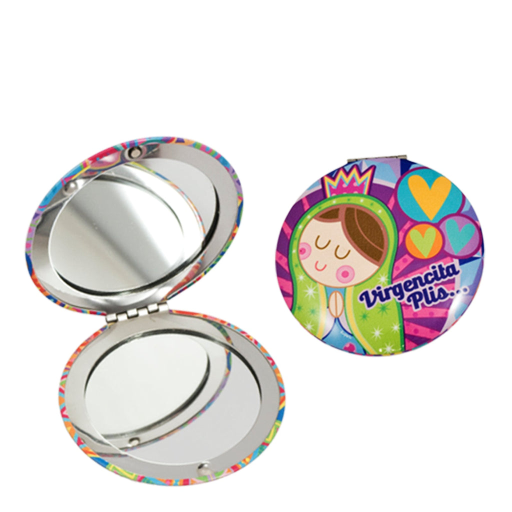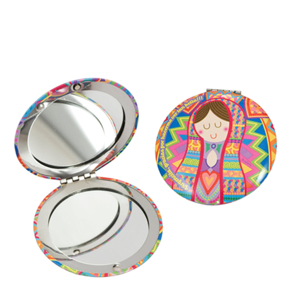 Espejo de bolsillo redondo de 7 cm con diseños inspirados en la Virgen de Guadalupe y diseñados por Distroller. El exterior está fabricado en acero, y es ideal para llevar a cualquier lugar sin que te ocupe nada de espacio.