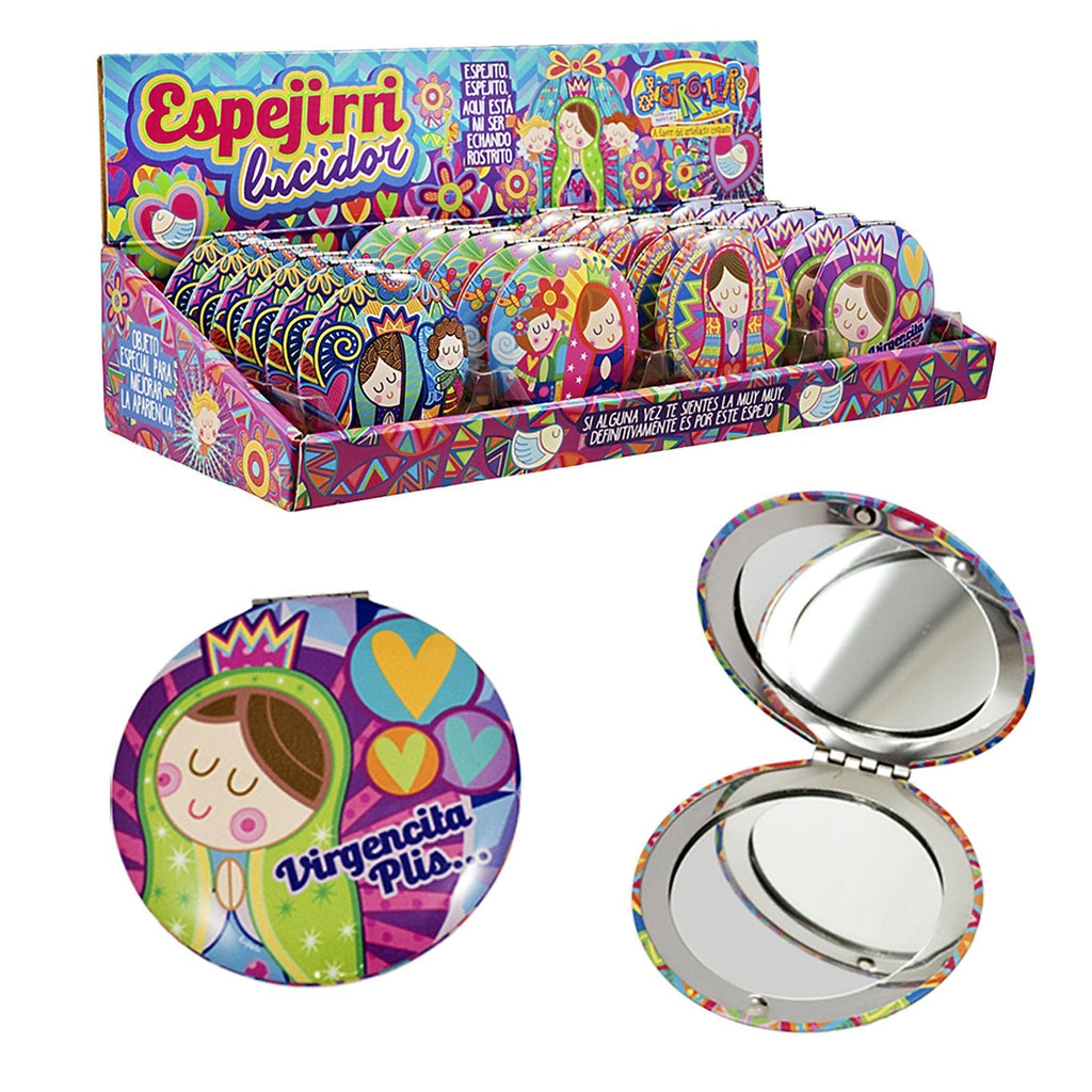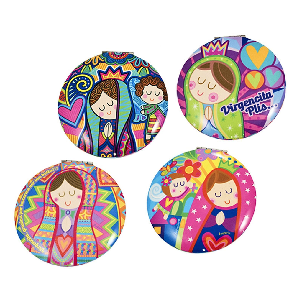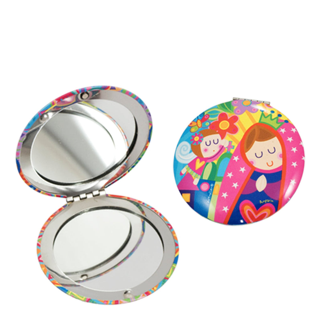 Espejo de bolsillo redondo de 7 cm con diseños inspirados en la Virgen de Guadalupe y diseñados por Distroller. El exterior está fabricado en acero, y es ideal para llevar a cualquier lugar sin que te ocupe nada de espacio.