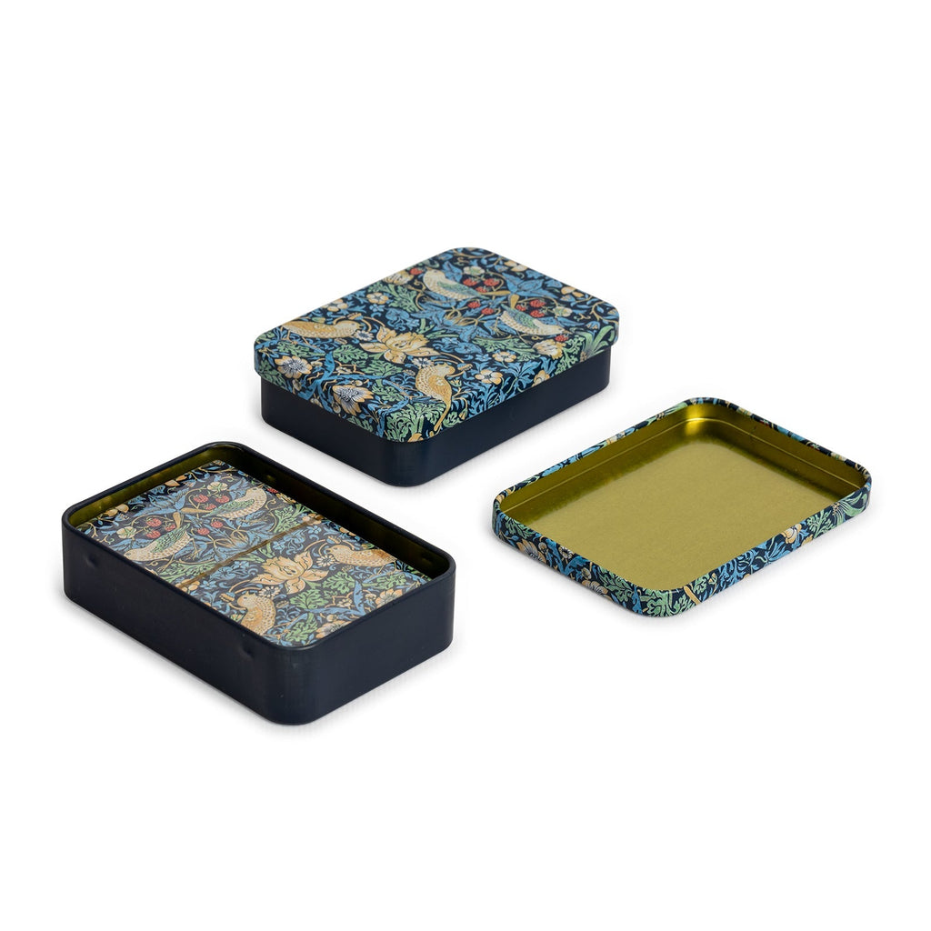 Se presentan en un estuche metálico con el mismo dibujo que el reverso de las cartas y cuenta con cierre a presión. Perfecto para que te puedas llevar tu baraja a cualquier lugar de forma segura.
