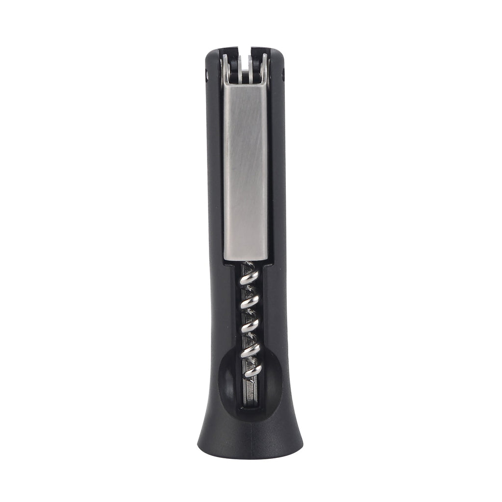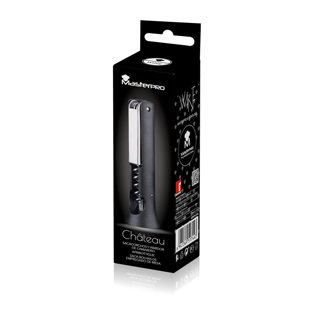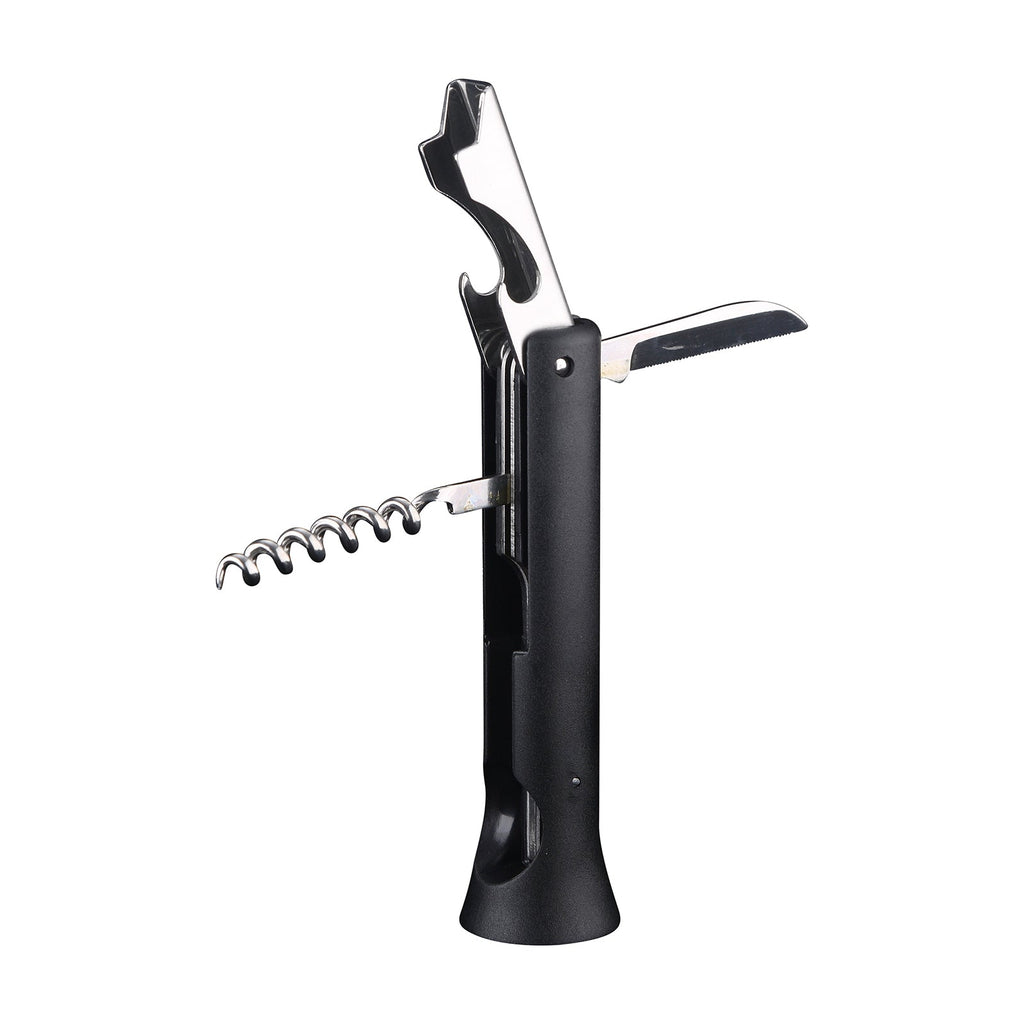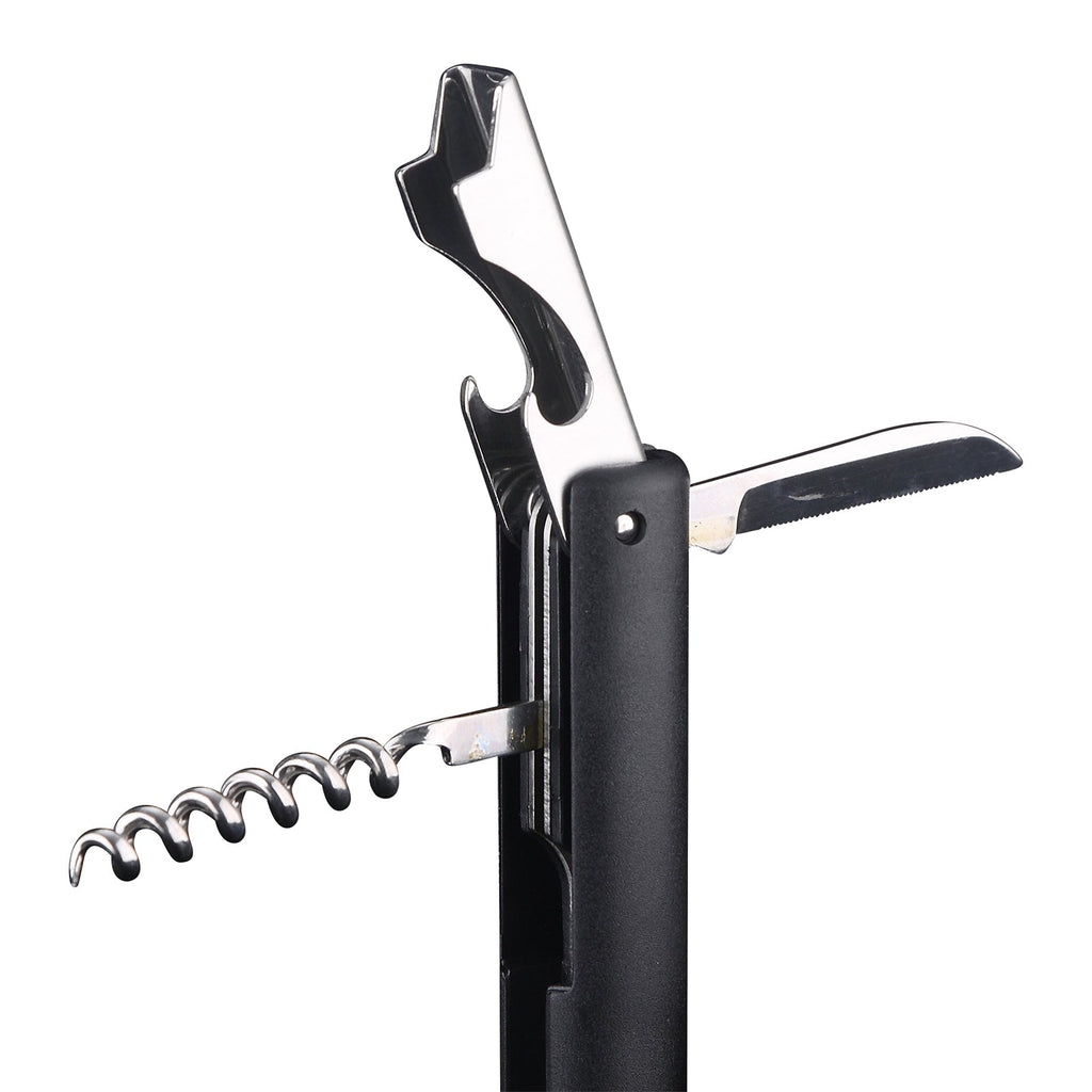 Sacacorchos de camarero fabricado en acero inoxidable. Cuerpo ergonómico en ABS, muy elegante y fácil de limpiar. Cuenta con sacacorchos, abrebotellas y corta precintos, todo en un diseño muy compacto y cómodo de usar.