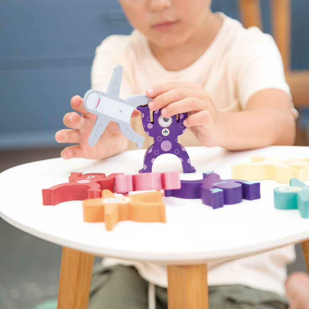Al estar hechos de madera, soportarán sin problema los golpes y caídas de las manitas principiantes. Con estos coloridos aliens, los más pequeños podrán pasar un buen rato subiéndolos unos encima de los otros trabajando su equilibrio y concentración a la vez que se divierten.